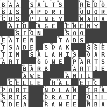 ACROSS 1. Sound made by sheep 4. Table seasonings 9. Make new 13. Again 14. To the left, to Queeg 15. Scent 16. Music discs 17. Abounding in pines 18. Hindu Mythology: god of death 19. Help 21. Ripen 22. Foe 24. The Jewish people; Israel 26. "Barney Miller" actor Jack 27. Eroded 29. Bits 30. Sadhe (variant) 31. Neighbor of Neb. 33. Compass dir. 36. Shallow baking pan 37. Deli grouping 40. Rowing implement 41. Nonscientific branch of learning 42. Went 43. Pieces 45. Sharp remark 47. Nick name for Arthur 48. Deep reverence 49. Against 50. Cell (Danish) 52. Actor Linden 54. And so on (abbr.) 56. Sweet dark-red dessert wine 57. Pitcher Ryan 59. Lyricist Gershwin 61. Indian titles of respect 62. Declaim 63. Lubricate 64. The main thing one is thinking about 65. Indian princess (variant) 66. Basketball assoc. DOWN 1. English channel? 2. Opera by Verdi 3. Aide 4. Plant excrement 5. Bee-related 6. Yearn 7. Family _ (genealogy) 8. Filthy place 9. Lover boys 10. Dutch treat 11. Rowboat 12. Mouth or opening 20. Passed on 22. 1973 Nobel Price Winner (Physics) Leo 23. Dreamland 25. Washington bills 27. Singer James 28. SW Saudi Arabia district 29. Not wild 31. Oscar Madison type 32. Daniel's nick name 33. Casting lots 34. Suttee (variant) 35. Celtic language 38. Match 39. Connect, as a bridge 44. Johnson of "Laugh-In" 45. Greek mezzo-soprano Agnes 46. Leather borer 49. Having winglike extensions 50. Drawstring 51. One of the Great Lakes 52. Israeli folk dance 53. ____ Jay Lerner 55. Baby bed with high sides 56. Air pressure measure (abbr.) 57. Or not 58. Born 60. Insect wing