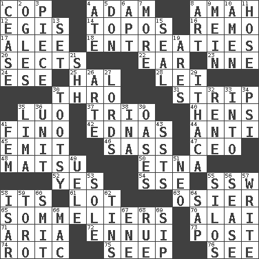 ACROSS 1. Police officer (slang) 4. First of billions? 8. Wet nurse 12. Armor plate that protects the chest 14. Literary convention 16. San ____ (Riviera town) 17. Toward shelter 18. Pleas 20. Religious groups 22. Ewer handle 23. Compass dir. 24. Compass dir. 25. Actor Linden 28. Luau accessory 30. Through, poetically 31. Empty completely 35. Nilotic language 37. Musical group of three 40. Coop moms 41. A pale, very dry sherry 42. Ferber et al. 44. Opposed to 45. Give off 46. Backtalk 47. Corporate head (abbr.) 48. Taiwanese island in East China Sea 50. Inactive volcano in Sicily 52. It is so 54. Compass dir. 55. Compass dir. 58. ___ a Wonderful Life 61. Car dealer's back yard 63. Flexible twig of a willow tree 65. Wine waiters 70. Mountain range southwest of Kyrgyzstan 71. Operatic vocal solo 72. World-weariness 73. Mail 74. College mil. group 75. Ooze 76. Perceive with the eye DOWN 1. Stop 2. Stares at amorously 3. Component 4. Had dinner 5. Spanish title 6. Fitting 7. Greater amount 8. Tate display 9. Count _ (2 wds.) 10. So be it 11. Stockings 13. Put into a specified state 15. Lick closed 19. Ancient Greek god of war 21. Quiet! 26. Johnson of "Laugh-In" 27. Nobles 29. New York city 30. A girl or young woman (variant) 32. French philosopher Descartes 33. To the inside or interior of 34. 23rd letter of the Greek alphabet 35. Pale green bean 36. A single undivided whole 38. _ tizzy (2 wds.) 39. Fertile tracts in a desert 41. Opposite of masc. 43. Fast planes 49. Ubangi River tributary 51. Modern: prefix 53. Not divided or shared with others 55. Grain storage towers 56. Gospel singer Marvin 57. Compose 58. Austrian river, tributary to the Danube 59. "Corrida" creature 60. Stricken, poetically 62. Canisters 64. Plant excrement 66. Big _ 67. Compass dir. 68. Sorrow 69. Small drink