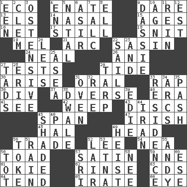 ACROSS 1. Environmental prefix 4. Maternal 9. Have the gumption 13. Raised railways 14. Relating to the nose 15. Matures 16. Fish or hair follower 17. Free of sound 18. In a ____ (agitated or irritated) 19. Cartoonist voice _ Blanc 21. Curve 22. Indian antelope 24. Anneal 26. Cuckoo 27. Trials 29. Event that recurs at intervals 30. Ascend 31. Of the mouth 33. Hit sharply and swiftly 36. HTML Container Element 37. Contrary to your interests or welfare 40. Period 41. Observe 42. Shed a tear 43. Plates 45. Connect, as a bridge 47. From or relating to Ireland 48. Actor Linden 49. Froth on beer 50. Buy and sell 52. Area sheltered from the wind 54. Teachers' org. 56. Frog relative 57. Smooth fabric 59. Compass dir. 61. Migrant worker of the '30s 62. Remove soap 63. Music discs 64. Look after 65. Feeling or showing extreme anger 66. Sight organ DOWN 1. Car or cant ending 2. To starve (Brit.) 3. Clearly or manifestly demonstrative 4. Followers of ems 5. Relating to or accompanying birth 6. SW Saudi Arabia district 7. Baby powder 8. Pipe bend 9. Hyrax 10. Hindu god of fire 11. It's straight from the horse's mouth 12. Eastern Standard Time (abbr.) 20. Allows 22. Travel by water 23. Added to 25. At sea 27. Small boys 28. 4th largest of the Great Lakes 29. Canvas cover 31. Baking chamber 32. To sift 33. Home 34. Arches 35. Romantic infatuation 38. A sleeping potion; an opiate (poet.) 39. Singer Brickell 44. SW Asia republic 45. Cast a shadow over 46. Groovy apt. 49. Robbery 50. Puff or smoke 51. Water falling in drops from the sky 52. Den 53. Inactive volcano in Sicily 55. "60 Minutes" Commentator Rooney 56. Small child 57. _ Lanka 58. Born 60. Compass dir.