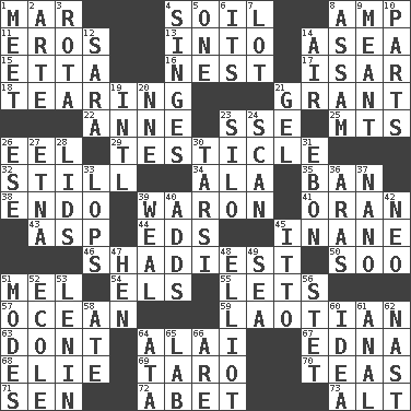 ACROSS 1. Impair 4. Earth 8. Electrical Unit 11. Greek god of love 13. To the inside or interior of 14. Toward the sea 15. Singer James 16. A home for chicks 17. Austrian river, tributary to the Danube 18. Pulling apart 21. Monetary aid 22. Singer Murray 23. Compass dir. 25. Mountains (abbr.) 26. Snakelike fish 29. One of the two male reproductive glands 32. Free from disturbance or agitation 34. Chicken ___ king 35. Forbid 38. Inside; within (prefix) 39. Make _____ (do battle with) 41. Northwest Algerian city 43. Viper 44. Begley and Asner 45. Lacking in sense or substance 46. Most dubious of character or honesty 50. "Barney Miller" actor Jack 51. Cartoonist voice _ Blanc 54. Raised railways 55. Allows 57. Sea 59. Of or relating to Laos or its people 63. Do not 64. Jai ____ 67. Pulitzer Prize-winning author Ferber 68. Writer Wiesel 69. Pacific island yam 70. Beverages made from leaves 71. Elected rep. 72. Collude with 73. Keyboard modifier key DOWN 1. Rendezvous 2. Johnson of "Laugh-In" 3. Round or rotation of duties 4. Scorches 5. Single 6. ___ a Wonderful Life 7. Car dealer's back yard 8. Indian state 9. Intended 10. Components 12. "Two Mules for Sister ____" 14. Atmosphere 19. International (abbr.) 20. Compass dir. 21. Set 23. Grain storage tower 24. Skim 26. Compass dir. 27. Inactive volcano in Sicily 28. Flaplike coverings 30. Tarsus (plural) 31. Inky black, to poets 33. Chops off 36. Ancient river in northeast Turkey 37. Billionth: prefix 39. Welt 40. Sums up 42. Modern: prefix 45. "Tell ____ the Marines!" 47. Layer 48. American author Paul (1891-1958) 49. Ocean 51. Methods 52. Learning spot: Fr. 53. Soviet premier 1918-24 56. Proofreading order 58. Had dinner 60. The content of cognition 61. Of or related to the anus 62. Political cartoonist Thomas 64. "One Day ___ Time" 65. Experiment locale 66. "We ___ not amused" (Victoria)