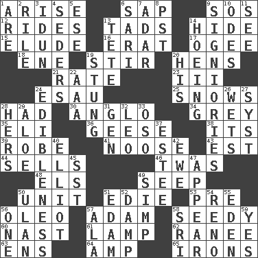 ACROSS 1. Ascend 6. Plant excrement 9. Mayday 12. Amusement-park features 13. Bits 14. Flintstone garb 15. Evade 16. Part of Q.E.F. 17. Double curve, resembling the letter S 18. Compass dir. 19. Use a spoon 20. Coop moms 21. Pace 23. One more than two 24. He sold his birthright 25. Frozen precipitation (plural) 28. Possessed 30. White American of non-Hispanic descent 34. Jennifer or Joel 35. Connecticut Ivy Leaguer 36. Honkers 38. It is 39. Loose flowing garment 41. Trap for birds or small mammals 43. Eastern Standard Time (abbr.) 44. Makes a sale 46. It was, poetically 48. Raised railways 49. Ooze 50. A single undivided whole 51. Singer Brickell 53. Before (prefix) 56. Butter sub 57. First of billions? 58. Shabby and untidy 60. Political cartoonist Thomas 61. Desk light 62. Indian princess (variant) 63. Followers of ems 64. Electrical Unit 65. Metal shackles DOWN 1. "We ___ not amused" (Victoria) 2. Cause heat under the collar 3. Goddess of spring and wife of Bragi 4. Spring feasts 5. Compass dir. 6. Indian skirt 7. The sixth month of the Jewish calendar 8. Pacific Standard Time (abbr.) 9. Seigniories (variant) 10. Lyric poems 11. Observe 13. False hair 14. Weeding 19. Feeling sharp psychological pain 20. Part of HMS, perhaps 22. Auto club (abbr.) 24. The property of being fit to eat 26. Soaks 27. System (abbr.) 28. Possessive pronoun 29. Medicinal plant 31. Commissioned military rank (abbr.) 32. Lion 33. Bear (Spanish) 37. First name in cosmetics 40. American author Paul (1891-1958) 42. She-sheep 45. Fast jet (abbr.) 47. Become visible 49. Simple or foolish person 50. ____ Bator, Mongolia 51. Dutch treat 52. Moist 54. Former U.S. Attorney General Janet 55. Genesis locale 56. Single 57. Wing 58. Indian title of respect (Mr.) 59. It is so