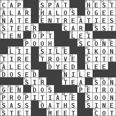 ACROSS 1. Head covering 4. Petty quarrel 8. Behest 12. Having or resembling wings 14. Rings 16. Double curve, resembling the letter S 17. Nathan's nickname 18. Pleas 20. Navigate 22. Automobile 23. Fast jet (abbr.) 24. "___ Little Indians" 25. Choose 28. Luau accessory 30. "Silly old bear" 31. Biscuitlike quick bread 35. Cards in a Roman deck? 37. Filth; sediment 40. Picture 41. Become fatigued 42. Collection of objects 44. Quote 45. Actor Baldwin 46. Colored 47. Area sheltered from the wind 48. Administered medicine 50. "Death on the ____" 52. Title for a knight 54. Afternoon social gathering 55. Manchild 58. Commissioned mil. rank 61. Two (Sp.) 63. Stone: prefix 65. Appease 70. Within a short period 71. Backtalk 72. Expletives 73. Trig term 74. Proofreading order 75. Rendezvous 76. Small bed DOWN 1. 2nd pers. sing. pres. of can (arch.) 2. Having winglike extensions 3. Eucharist need 4. A female animal or person 5. Baking dish 6. Keyboard modifier key 7. Torque (variant) 8. Being at a high temperature 9. Armor plate that protects the chest 10. Observes 11. Trial 13. To riddle 15. Lick closed 19. Ancient Greek god of war 21. Friend of Pooh 26. Mail 27. One of three equal parts 29. Hanging ice 30. Components 32. Migrant worker of the '30s 33. Musical sound 34. Compass dir. 35. _ and Stitch 36. Angers 38. Myrna of the movies 39. Incident 41. Small amount or degree 43. Singer Brickell 49. "You Light Up My Life" star Conn 51. Pet locale 53. Printing process, for short 55. Unemotional 56. U. of Maine site 57. Music written for nine 58. Global Positioning Systems (abbr.) 59. Part of Q.E.F. 60. Sense of smell 62. Thailand, formerly 64. Double-curved letter 66. Pacific Standard Time (abbr.) 67. Had dinner 68. Definite Article 69. Eastern Standard Time (abbr.)