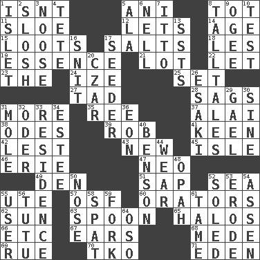 ACROSS 1. Is not 5. Cuckoo 8. Small child 11. A type of plum 12. Allows 14. Personal question 15. Plunders 17. Table seasonings 18. French article 19. Gist 21. Car dealer's back yard 22. Allow 23. Definite Article 24. Ending with capital 25. Put into a specified state 27. Bit 28. Settles 31. Greater amount 35. To sift 37. Jai _ 38. Lyric poems 39. Director Reiner 41. Peachy ____! 42. For fear that 43. ___ Haven, CT 45. Small island 46. One of the Great Lakes 47. Modern: prefix 49. Lair 51. Plant excrement 52. Ocean 55. Shoshoni 57. Order of Saint Francis (abbr.) 60. Speakers 62. Player for Phoenix 63. Soup utensil 65. Rings 66. And so on (abbr.) 67. Hearing organs 68. Ancient Persian 69. Sorrow 70. Ring climax 71. Locale of original sin DOWN 1. Small island 2. Make a splashing sound 3. Trap for birds or small mammals 4. Wig 5. Wing 6. 1994 drama film starring Jodie Foster 7. "Tell ____ the Marines!" 8. Baron Munchausen's specialties 9. Double curve, resembling the letter S 10. Trial 13. Fast planes 16. In a ____ (agitated or irritated) 17. Sowing specialist 20. Russian ruler of old 26. 1973 Nobel Price Winner (Physics) Leo 29. Highlander 30. Trig term 31. Undercover agent 32. River in Europe 33. Home 34. First name in cosmetics 36. A really long time 40. Gillaume's butler role 44. Erode 48. Brightly colored fish 50. Characteristic smell of wine 52. Having a sole or soles 53. Wear away 54. NE Netherlands city 55. One who uses or employs something 56. Ballerina skirt 58. Petty quarrel 59. Tined utensil 61. Not wild 64. Bear (Spanish)