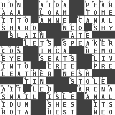 ACROSS 1. Spanish title 4. Opera by Verdi 8. Lightbulb-shaped fruit 12. Auto club (abbr.) 13. Rich soil 14. Heavy book 15. "Tell ____ the Marines!" 17. Singer Murray 18. Lessep's creation 19. Broken piece 21. Non-commissioned officer (abbr.) 23. Like a shrinking violet 24. Killed 26. Had dinner 28. Allows 30. Orator 34. Music discs 37. South American Indian 39. San ____ (Riviera town) 40. Sight organ 41. Theater features 43. 54 in ancient Rome 44. To the inside or interior of 46. One of the Great Lakes 47. Before (prefix) 48. Cordwainer's material 51. Soft 54. Metal container 55. Fur scarf 58. Small island 61. Directed 63. Sports stadium 65. Slow-paced one 67. Small island 71. Of or related to the anus 72. Goddess of spring and wife of Bragi 73. "______ My Girl" (Turtles hit) 74. ___ a Wonderful Life 75. Roll call or roster of names 76. Behest 77. Modern: prefix DOWN 1. Raised platform 2. Expletives 3. Brizilian seaport 4. In the manner of 5. Electrically charged atom 6. Daniel's nick name 7. So be it 8. Parent Teacher Assoc. 9. Immeasurably long periods of time 10. Wet nurse 11. Have confidence or faith in 16. Of the mouth 18. ____ d'Azur (French Riviera) 20. Expire 22. Head covering 25. Nuclear Threat Initiatives 27. Ewer handle 29. Scornful expression 30. Smooth fabric 31. Seaweed 32. Arab leader 33. Be footloose 34. To provide with a ceiling 35. Centimeter-gram-second unit of force 36. Stalk of a moss capsule 38. Automobile 42. Perceives with the eye 45. Baseball player Mel 49. Land elevation 50. Compass dir. 52. R.R. building 53. Israeli folk dance 56. Soviet premier 1918-24 57. Maternal 58. SW Saudi Arabia district 59. Southeast Asian peninsula 60. Tense 62. Food container 64. In addition 66. _ tizzy (2 wds.) 68. A female animal or person 69. French article 70. Eastern Standard Time (abbr.)