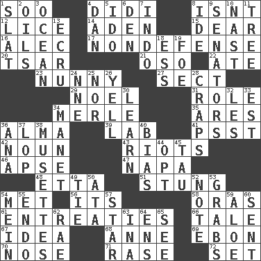 ACROSS 1. "Barney Miller" actor Jack 4. "You Light Up My Life" star Conn 8. Is not 12. Louse (plural) 14. An important port of Yemen 15. Letter starter 16. Actor Baldwin 17. Unrelated to defense, as in spending 20. Russian ruler of old 21. Bear (Spanish) 22. Had dinner 23. Pet term 27. Religious group 29. Christmas carol 31. Hero or heavy, e.g. 34. Haggard of country music 35. Ancient Greek god of war 36. _ mater 39. Experiment locale 41. Inconspicuous attention getter 42. Part of speech 43. Disturbances 46. Domed church section 47. California wine valley 48. Singer James 51. Feeling sharp psychological pain 54. Was introduced to 56. ___ a Wonderful Life 58. Mouths or openings 61. Pleas 66. Story 67. The content of cognition 68. Singer Murray 69. Inky black, to poets 70. Sense of smell 71. Raze (variant) 72. Arrange properly for use DOWN 1. Narrow board 2. Petroleums 3. Sea 4. Daniel's nick name 5. Wedding promise 6. Lair 7. _ china 8. Binary compound 9. Legislators 10. Political cartoonist Thomas 11. Family _ (genealogy) 13. Shade of tan 18. Curvy letter 19. Enemy 24. Compass dir. 25. Or not 26. Shout 28. Dice game 30. Acquire or gain knowledge or skills 32. French article 33. Eastern Standard Time (abbr.) 34. French painter Edouard 36. Santa ___, CA 37. Chop off 38. French bagpipes 40. Prejudice 44. Choose 45. The 19th letter of the Greek alphabet 49. Make a knot 50. _ moment's notice (2 wds.) 52. Short letter 53. Seizes 54. Count _ (2 wds.) 55. Inside; within (prefix) 57. Play the lead 59. _ vera 60. Emitted 62. Actress Charlotte 63. _ tizzy (2 wds.) 64. Followers of ems 65. Perceive with the eye