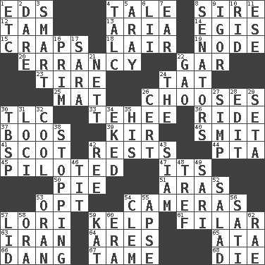 ACROSS 1. Begley and Asner 4. Story 8. Male parent of an animal 12. Scottish cap 13. Operatic vocal solo 14. The front part of a cuirass 15. Dice game 18. Den 19. Connecting point 20. The state or an instance of erring 22. Slender fish 23. Hoop that covers a wheel 24. Make lace 25. Floor protector 26. Opts 30. Affectionate concern, for short 33. Giggle 36. Travel on an animal 37. Scornful sounds 39. Apertif with cassis 40. Stricken, poetically 41. Native of Scotland 42. Musical pauses 44. Parent Teacher Assoc. 45. Manned the helm 47. It is 50. Sliced dessert 51. Caspian sea tributary 53. Choose 54. Devices for capturing images 57. Australian parrot (variant) 59. Seaweed 61. Of or pertaining to a thread or threads 63. SW Asia republic 64. Ancient Greek god of war 65. _ moment's notice (2 wds.) 66. Mild oath, euphamism for damn 67. Docile 68. Pass on DOWN 1. And so on (abbr.) 2. Have the gumption 3. Don Adams' spy role 4. Baby powder 5. Like ___ of sunshine 6. Cards in a Roman deck? 7. Ewer handle 8. Legislators 9. Composer Stravinsky 10. To free from 11. Compass dir. 16. Demure 17. "Two Mules for Sister ____" 21. Remaining after all deductions 22. E Mali city 24. Definite Article 26. Certainty 27. Simple or foolish person 28. Prepare for publication 29. Stalk of a moss capsule 30. Cook's measure (abbr.) 31. Locales 32. Calm and collected 34. Made supply last 35. Part of HMS, perhaps 38. Obstructing or blocking passage 42. To sift 43. Thailand, formerly 46. Teat (slang) 48. Unclean, religiously 49. Indian skirt 52. Vegetable dish 53. NW Algerian seaport 54. Clement's nick name 55. Domed church section 56. Suttee (variant) 57. Flaplike covering 58. Mouth or opening 59. Krazy ___ of comics 60. Period 62. Actress Charlotte