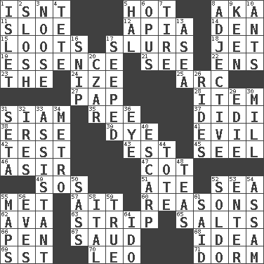 ACROSS 1. Is not 5. Being at a high temperature 8. Alias (abbr.) 11. A type of plum 12. Capital of Western Samoa 14. Lair 15. Plunders 17. Plays smoothly or legato 18. Passenger plane 19. Gist 21. Perceive with the eye 22. Followers of ems 23. Definite Article 24. Ending with capital 25. Curve 27. Infant food 28. A distinct part 31. Thailand, formerly 35. Portuguese money of account (variant) 37. "You Light Up My Life" star Conn 38. Celtic language 39. Color 41. Morally bad or wrong 42. Trial 43. Eastern Standard Time (abbr.) 45. Sew up the eyelids of hawks and falcons 46. SW Saudi Arabia district 47. Small bed 49. Mayday 51. Had dinner 52. Ocean 55. Was introduced to 57. Small island 60. Thinks logically 62. Actress Gardner 63. Empty completely 65. Table seasonings 66. Animal enclosure 67. Saudi Arabian king (1953-1964) 68. It may be bright or harebrained 69. Fast jet (abbr.) 70. Lion 71. Dormintory (informal) DOWN 1. Small island 2. Splash clumsily 3. Trap for birds or small mammals 4. Wig 5. Actor Linden 6. Musical composition 7. Hoop that covers a wheel 8. Descriptive word 9. Peachy ____! 10. Pismires 13. Toward the sea 16. Clip 17. Oozed 20. Russian ruler of old 26. Amusement-park features 29. Singer Brickell 30. Place where flour is made 31. Stalk of a moss capsule 32. Angers 33. Aide 34. Paris' subway 36. Sight organ 40. Fortification 44. Haul 48. Afternoon social gatherings 50. Backtalk 52. Twentieth part of a lira 53. Keyboard key 54. Indian state 55. Atlas contents 56. Nights before holidays 58. Slanted text style (abbr.) 59. Loyal 61. Stated 64. Wedding promise