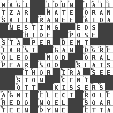 ACROSS 1. Wise men 5. Goddess of spring and wife of Bragi 9. Jacques of French films 13. Czar 14. Nathan's nickname 15. Northwest Algerian city 16. Suttee (variant) 17. Indian princess (variant) 18. Opera by Verdi 19. Nestling 21. Begley and Asner 22. Flintstone garb 23. Airs 24. R.R. building 27. For each 28. Gouge 29. Tarsus (plural) 31. Separate the seeds from cotton 32. Legendary monster 36. Butter sub 37. Allow head to fall sleepily 38. Of the mouth 39. Lightbulb-shaped fruit 40. "Barney Miller" actor Jack 41. Narrow boards 42. Son of Odin 44. Retirement account (abbr.) 46. Perceive with the eye 47. The Jewish people; Israel 48. Penny 50. Baseball player Mel 51. Smoochers 54. Hindu god of fire 56. Voters do this 58. Hero or heavy, e.g. 60. Do over again 61. Christmas carol 62. Fly high 63. Adolescent 64. Centimeter-gram-second unit of force 65. Singer James DOWN 1. Mountains (abbr.) 2. Muslim summons to prayer 3. Yard entry 4. From or relating to Ireland 5. More empty; more void 6. Mild oath, euphamism for damn 7. Shoshoni 8. Born 9. Inedible or poisonous agaric 10. Originate 11. Small amount or degree 12. _ tizzy (2 wds.) 17. Travel on an animal 20. Native american tent (variation) 21. Age 23. Animal enclosure 24. Close up, plug up 25. Falsehood 26. Type of rug 28. June honoree 30. Conclusion 31. Thick or sticky substance 33. Pate de foie ____ 34. Pace 35. Otherwise 37. Not either 40. Boy, to dad 41. Without 43. Being at a high temperature 44. Tapering mass of hanging ice 45. State of inaction 47. Message 49. Laconic 51. Peachy ____! 52. Carrot, for example 53. Narrow board 54. Tate display 55. Unit of force equal to gravity 56. Conclude 57. Myrna of the movies 59. Period
