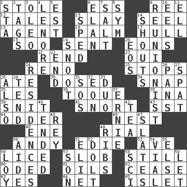ACROSS 1. Fur scarf 6. Double-curved letter 9. To separate or throw off 12. Falsehoods 13. Kill 14. Stitch closed the eyes of (a falcon) 15. Rep 16. Inside of hand 17. Frame or body of a ship 18. "Barney Miller" actor Jack 19. Emitted 20. Immeasurably long periods of time 21. Tear apart 23. Fr. "Yes" 24. Western Nevada city 25. Obstructs or blocks passage 28. Had dinner 30. Administered medicine 34. Fastener 35. French article 36. Woman's close-fitting hat 38. _ tizzy (2 wds.) 39. In a ____ (agitated or irritated) 41. Derisive sound 43. Fast jet (abbr.) 44. More peculiar 46. Egg locale 48. Compass dir. 49. Monetary unit of Yemen 50. Actor Griffith 51. Singer Brickell 53. "___ Maria" 56. Louse (plural) 57. Oscar Madison type 58. Free from disturbance or agitation 60. Wrote a lyric poem 61. Petroleums 62. Stop 63. It is so 64. Fish or hair follower 65. Small island DOWN 1. R.R. building 2. Labels 3. Butter sub 4. Poe poem 5. Eastern Standard Time (abbr.) 6. Enthusiasm 7. Table seasoning 8. Symbol (abbr.) 9. One who advocates reunion 10. Snakelike fish 11. Pipe bend 13. Hurried 14. Yells 19. Snout, nose 20. Greek goddess of the dawn 22. Conclude 24. Homes 26. Baking dishes 27. Argument over a trivial matter 28. In addition 29. Watch over 31. Distress signal 32. A really long time 33. Superhero pair 37. Bert's buddy 40. Looked after 42. Afternoon social gathering 45. Marina Del _, California 47. Chalkboards 49. Teases 50. Assistant 51. Writer Wiesel 52. Stupid person 54. Small bottle 55. Otherwise 56. Myrna of the movies 57. Manchild 58. _-fi 59. Allow