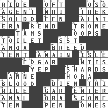 ACROSS 1. Travel on or in a vehicle 5. Often (poetically) 8. Bear (Spanish) 11. Rep 13. Medical imaging device (abbr.) 14. Long journey 15. Twentieth part of a lira 16. Car or cant ending 17. Mountain range southwest of Kyrgyzstan 18. Period 19. Tear apart 21. Heavy duty weighing machine 22. Scottish caps 24. I made a mistake 25. Rest room 27. Fast jet (abbr.) 29. Small Philippine buffalo 30. A special lineage 32. Portable shelter 33. At full speed 35. Capri or Wright 39. _ Allan Poe 41. Nuclear Threat Initiatives 42. Slangy assent 43. Broken pieces 45. Singer Murray 48. Israeli folk dance 49. Vital fluid 50. South Vietnam president (1954) 52. Three (prefix) 55. Cause heat under the collar 56. Slender fish 57. Keyboard key 59. Of or related to the anus 60. Mouth or opening 61. Biscuitlike quick bread 62. "___ Little Indians" 63. Fenced enclosure 64. Washington bills DOWN 1. To erase 2. Russian composer Stravinsky 3. Conveyance 4. Conclude 5. Sign of something about to happen 6. Flintstone 7. Metal container 8. Fourth or lowest deck 9. Seines 10. Migrant worker of the '30s 12. Singer Mel 14. Pacific island yam 20. Eastern Standard Time (abbr.) 21. Haul 23. Having winglike extensions 25. Make lace 26. Single 27. Indian title of respect (Mr.) 28. Elected rep. 30. Drinking establishment 31. Middle Eastern gold or silver currency 33. Grow older 34. Atlas unit 36. Ski resort town in Vermont 37. Flaplike covering 38. Double-curved letter 40. Colored 43. A female animal or person 44. Residences 45. Place in a line 46. Pitcher Ryan 47. Christmas carol 49. Naughty child 50. Have the gumption 51. SW Asia republic 53. French philosopher Descartes 54. Angers 56. Republican Party 58. Non-commissioned officer (abbr.)