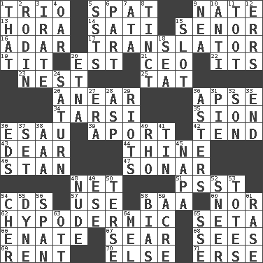 ACROSS 1. Musical group of three 5. Petty quarrel 9. Nathan's nickname 13. Israeli folk dance 14. Suttee (variant) 15. Sir (Sp.) 16. The sixth month of the Jewish calendar 17. Interpreter 19. Teat (slang) 20. Eastern Standard Time (abbr.) 21. Corporate head (abbr.) 22. It is 23. Egg locale 25. Make lace 26. Approach 30. Domed church section 34. Tarsus (plural) 35. The Jewish people; Israel 36. Son of Isaac 39. To the left, to Queeg 42. Look after 43. Letter starter 44. One or ones belonging to thee 46. Comedian Laurel of Laurel & Hardy 47. Echolocation 48. Fish or hair follower 51. Inconspicuous attention getter 54. Music discs 57. Purpose 58. Sound made by sheep 60. Or not 62. Subcutaneous 65. Stalk of a moss capsule 66. Maternal 67. Dry up 68. Observes 69. Monthly bill 70. Otherwise 71. Celtic language DOWN 1. Not this but _ 2. "The Thinker" sculptor 3. Feeling or showing extreme anger 4. Boat paddle 5. Fast planes 6. Component 7. "One Day ___ Time" 8. Tinged 9. Teachers' org. 10. Against 11. A blast of a horn 12. Blunders 15. Groove 18. Ocean 20. Inactive volcano in Sicily 24. Titan orbits this 27. Period 28. Viper 29. Debaucheries 30. Michaelmas daisies 31. Sliced dessert 32. Male child 33. Conclude 36. Begley and Asner 37. Put into a specified state 38. American Automobile Association (abbr.) 40. 17th letter of the Greek alphabet 41. Metal container 45. California wine valley 48. Unadorned 49. Compass dir. 50. Laconic 52. Scornful expression 53. Hauls 54. "Mermaids" star 55. Unit of force 56. Connect, as a bridge 58. Prejudice 59. 1/640 square mile 61. Raze (variant) 63. Baseball player Mel 64. Cartoonist voice _ Blanc 65. Compass dir.