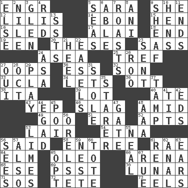 ACROSS 1. Engineer (abbr.) 5. "Two Mules for Sister ____" 9. A female animal or person 12. Ms. Damita and namesakes 14. Inky black, to poets 15. Layer 16. Bobsleighs 17. Jai _ 18. Conclusion 19. Car or cant ending 20. College papers 23. Backtalk 24. At sea 25. Unclean, religiously 27. I made a mistake 30. Curvy letter 32. Male child 33. Southern CA. univ. 34. Allows 36. Baseball player Mel 38. Call ___ day 39. Car dealer's back yard 40. Had dinner 43. Slangy assent 46. Volcanic refuse 48. Among 49. Thick or sticky substance 51. Epoch 52. Tenement units (abbr.) 53. Den 54. Inactive volcano in Sicily 56. Alleged 58. Main course 61. Actress Charlotte 64. Shade tree 65. Butter sub 66. Sports stadium 68. Compass dir. 69. Inconspicuous attention getter 70. Type of eclipse 71. Distress signal 72. False hair 73. Snakelike fish DOWN 1. Otherwise 2. "Death on the ____" 3. Small, secluded valley 4. To free from 5. Oceans 6. Competent 7. Exposes to great heat 8. Cuckoo 9. To gather and bind into a bundle 10. Coop moms 11. Extremities 13. Fast planes 21. The bottom of a shoe or boot 22. Artist's stands 23. Posted 24. White ___ sheet 26. Friend of Pooh 27. Fr. "Yes" 28. Sep. follower 29. Romp 31. Fur scarf 35. A viewer who gazes fixedly 37. Pack (down) 41. Teat (slang) 42. Begley and Asner 44. Mild oath 45. Luau course 47. Yard entry 48. American Automobile Association (abbr.) 50. Threatening words 53. Citrus fruits 55. Be tempered by heat 56. Perceives with the eye 57. In addition 59. Egg locale 60. Carry 61. French philosopher Descartes 62. Of or related to the anus 63. Hearing organs 65. Choose 67. Regret