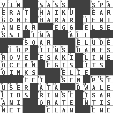 ACROSS 1. Zeal 4. Backtalk 8. Health resort 11. Part of Q.E.F. 13. Japanese poetic form 15. Ewer handle 16. Went 17. Ethiopian city, capital of Harari 18. Portable shelter 19. Approach 21. Ovum 22. Otherwise 23. Fast jet (abbr.) 24. _ tizzy (2 wds.) 27. Everything 29. Fly high 30. Dodge 34. Chop off 36. Airtight sealed metal containers 39. Natives or inhabitants of Denmark 40. Be footloose 41. 1973 Nobel Price Winner (Physics) Leo 43. Actor's bit 44. Sea 46. Armor plate that protects the chest 47. It is 48. Pig sounds 49. Writer Wiesel 51. Bank Draft (abbr.) 53. Elected rep. 54. Pacific Standard Time (abbr.) 57. One who uses or employs something 60. _ moment's notice (2 wds.) 63. A sleeping potion; an opiate (poet.) 65. Hats (slang) 66. Wash lightly 69. Austrian river, tributary to the Danube 70. Cuckoo 71. Declaim 72. Nuclear Threat Initiatives 73. Fish or hair follower 74. Flair 75. Compass dir. DOWN 1. Viva Las _ 2. Metal shackles 3. French painter Edouard 4. Quiet! 5. American Automobile Association (abbr.) 6. Title for a man of rank and authority 7. Heroin 8. Sew up the eyelids of hawks and falcons 9. Baking dishes 10. Johnson of "Laugh-In" 12. Afternoon social gathering 14. Capital and largest city of Mongolia 18. Copy Pinocchio 20. River (Sp.) 25. Nathan's nickname 26. Ascend 28. Directed 29. Orators 31. A single undivided whole 32. Habitations of wild animals 33. Compass dir. 34. Event scenes 35. Baking chamber 37. Tired old horse 38. Atmospheres 40. Friend of Pooh 42. Small island 45. Science/research agcy. 50. Indiana (abbr.) 52. Pacific island yam 54. Thick mixture 55. Killed 56. Laconic 57. Uhlan (variant) 58. Trig term 59. Prepare for publication 61. Hoop that covers a wheel 62. Of or related to the anus 64. Acquire through effort 67. R.R. building 68. Car or cant ending