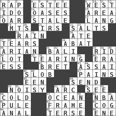 ACROSS 1. Hit sharply and swiftly 4. First name in cosmetics 9. 270 degrees 13. Wedding promise 14. Fertile tracts in a desert 15. Type of rug 16. Rowing implement 17. Lacking originality or spontaneity 18. Long (Scottish) 19. Mountains (abbr.) 21. Big collection agency 22. Table seasonings 24. Precipitation 26. Had dinner 27. Pulls apart 29. Blind as ____ 30. Believer in; advocate of (suffix) 31. Indonesian resort city 33. To free from 36. Car dealer's back yard 37. Pulling apart 40. Epoch 41. Double-curved letter 42. Cy Young winner Saberhagen 43. Slender Brazilian palm 45. Oscar Madison type 47. Aches 48. Car or cant ending 49. Post 50. Annoyingly loud 52. Curve 54. Perceive with the eye 56. Chilled 57. Sea 59. Basketball assoc. 61. Whimper 62. Movie unit 63. Gear tooth 64. Of or related to the anus 65. Laconic 66. Compass dir. DOWN 1. River (Sp.) 2. First man 3. Likenesses of persons 4. Greek goddess of the dawn 5. Smooth fabric 6. Russian ruler of old 7. Snakelike fish 8. Compass dir. 9. Place for singles 10. Part of Q.E.F. 11. Elected reps. 12. Label 20. "Two Mules for Sister ____" 22. Unit of acoustic absorption 23. _ moment's notice (2 wds.) 25. Is not 27. Falsehood 28. Greek god of love 29. Came down and settled, as after flight 31. Sharp remark 32. "We ___ not amused" (Victoria) 33. Home 34. SW Asia republic 35. Raised platform 38. Black 39. Yawn 44. Without 45. Beer mug 46. French article 49. Fraudulent business schemes 50. Part of speech 51. Rounded earthenware pot or jar 52. 1/640 square mile 53. Stern 55. Inky black, to poets 56. Tax preparer (abbr.) 57. Often (poetically) 58. Born 60. Grow older