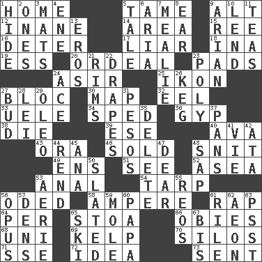 ACROSS 1. Residence 5. Docile 9. Keyboard modifier key 12. Lacking in sense or substance 14. Length times width 15. To separate or throw off 16. Prevent from occurring 17. One who doesn't tell the truth 18. _ tizzy (2 wds.) 19. Double-curved letter 20. Severe or trying experience 23. Writing tablets 24. SW Saudi Arabia district 25. Picture 27. Group of countries in special alliance 30. Atlas unit 32. Snakelike fish 33. Ubangi River tributary 34. Hurried 36. Hustle 38. Pass on 39. Compass dir. 40. Actress Gardner 43. Mouth or opening 46. Exchanged or delivered for money 48. In a ____ (agitated or irritated) 49. Followers of ems 51. Observe 52. Toward the sea 53. Of or related to the anus 54. Canvas cover 56. Wrote a lyric poem 58. Electrical Unit 61. Strike 64. For each 65. Portico 66. Off-Broadway awards 68. Corn or form start 69. Seaweed 70. Grain storage towers 71. Compass dir. 72. It may be bright or harebrained 73. Posted DOWN 1. Flintstone garb 2. Singles 3. Floor coverings 4. Compass dir. 5. Lie 6. Roberta Peters solo 7. Ear of corn 8. Ewer handle 9. Believer in; advocate of (suffix) 10. Grant temporary use of 11. Afternoon social gatherings 13. Greek god of love 21. Basketball hoops 22. Window treatments 23. More than one (prefix) 24. Adept person 26. Barrel 27. Partially opened flower 28. Luau accessory 29. Margarine 31. Mexican monetary units 35. Keyboard key 37. Baking dishes 41. Compete 42. "One Day ___ Time" 44. Tear apart 45. Santa ___, CA 47. Letter starter 48. Plant excrement 50. Scheduled 53. Nest on high 55. Vintage cars 56. Musical composition 57. Lairs 59. Undercover agent 60. Dad 61. Cause heat under the collar 62. A really long time 63. Inconspicuous attention getter 65. What Jean-Claude Killy likes to do 67. Again