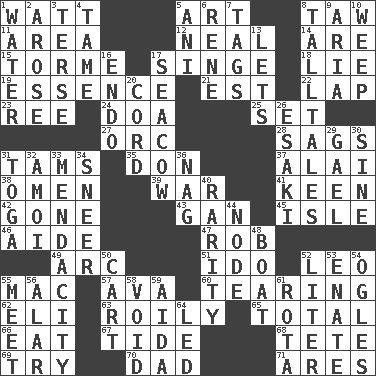 ACROSS 1. Electrical Unit 5. Tate display 8. The 23rd letter of the Hebrew alphabet 11. Type of rug 12. Anneal 14. "We ___ not amused" (Victoria) 15. Singer Mel 17. Scorch 18. Whopper 19. Gist 21. Eastern Standard Time (abbr.) 22. Infant locale 23. Portuguese money of account (variant) 24. ___ good deed 25. Put into a specified state 27. The grampus (Milton) 28. Sinks 31. Scottish caps 35. Spanish title 37. Mountain range southwest of Kyrgyzstan 38. Sign of something about to happen 39. Armed conflict 41. Peachy ____! 42. Went 43. Separate the seeds from cotton 45. Capri or Wright 46. Helper 47. Director Reiner 49. Curve 51. Wedding promise 52. Lion 55. Big _ 57. Actress Gardner 60. Pulling into pieces 62. Connecticut Ivy Leaguer 63. Turbulent 65. Add up to 66. Ingest 67. Event that recurs at intervals 68. Wig 69. Attempt to accomplish something 70. June honoree 71. Ancient Greek god of war DOWN 1. Wetness 2. Came up 3. Laconic 4. Docile 5. Black tropical American cuckoo 6. French philosopher Descartes 7. Labels 8. Baron Munchausen's specialties 9. Roberta Peters solo 10. Shed a tear 13. Allows 16. Inside; within (prefix) 17. Manatee 20. Drawstring 26. 1973 Nobel Price Winner (Physics) Leo 29. Highlander 30. Trig term 31. Ancient Roman robe 32. Mine, in Marseilles 33. Ananias' fault 34. Scornful expression 36. Tired old horse 40. Noteworthy scarcity 44. Thickened enlargement 48. Water vessel 50. Heavy open wagon 52. 61 cubic inches 53. Related on the mother's side 54. Stares at amorously 55. Confront 56. Having or resembling wings 58. Lacking any legal or binding force 59. Opera by Verdi 61. Round or rotation of duties 64. Directed