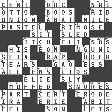 ACROSS 1. Penny 5. The grampus (Milton) 8. Indian title of respect (Mr.) 11. "Beetle Bailey" pooch 12. Expressions of contempt or scorn 14. To free from 15. The state of being joined or united 17. Blind as ____ 18. Mediterranean tributary 19. Soft color 21. Full of chinks, cracks, or crevices 23. Be seated 25. Downhill vehicle 26. Hankering 27. Biblical high priest 28. Mayday 31. Part of HMS, perhaps 33. Age 35. Group of southern Bantu languages 37. Bristle 38. Strike 40. Baltic tributary 41. Lacerates 43. E Mali city 45. Double-curved letter 46. 100% 47. Followers of ems 50. Hats (slang) 52. Writer Wiesel 53. Insidious 54. Bungled 56. Sounds asleep 61. Component 62. Certainty 65. Eat (away) 66. Lyricist Gershwin 67. 4th largest of the Great Lakes 68. "This won't hurt ____!" 69. Snakelike fish 70. Manchild 71. Allows DOWN 1. Overturn; upset 2. Inactive volcano in Sicily 3. Nuclear Threat Initiatives 4. A blast of a horn 5. Chief or king in Benin or Nigeria 6. Director Reiner 7. Rough 8. Indian titles of respect 9. Cause heat under the collar 10. Binary compound 13. Free of sound 16. A home for chicks 18. Lower and raise head in agreement 20. Louse (plural) 22. Chow _ 24. Son of Odin 26. Austrian river, tributary to the Danube 28. Beer foam 29. Singles 30. Title for a knight 31. Person who is morally reprehensible 32. Slanted text style (abbr.) 34. Tired old horse 36. Moves 37. R.R. building 39. Friends 42. Itself 44. Petroleums 48. Sibling's daughter 49. Spring feasts 51. Unit of force 52. Bank Draft (abbr.) 54. Female horse 55. Mountain range 57. Spoken 58. Loose flowing garment 59. Prepare for publication 60. Arranges properly for use 61. Sliced dessert 63. _ de Janeiro 64. Nine, plus one