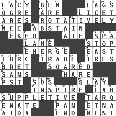 ACROSS 1. Made of lace 5. Benjamin's nick name 8. Straggles 12. Legendary monster 13. "We ___ not amused" (Victoria) 14. It is permitted: Lat. 15. Ancient Greek god of war 16. Happening in regular succession 19. Born 20. Choose not to consume 21. Supplemented with great effort 23. Had dinner 24. Health resort 27. Unable to walk 30. Discontinue 31. Develop 34. Compass direction 35. Torque (variant) 38. Swap 40. Angers 41. Cy Young winner Saberhagen 42. Flew 44. Without 45. Female horse 46. Pacific Standard Time (abbr.) 47. Distress signal 50. Kill 53. Stimulate to action 57. Experiment locale 59. Supplying deficiencies 63. Pacific island yam 64. Maternal 65. Baking dish 66. Inactive volcano in Sicily 67. Opera by Verdi 68. Conclude 69. A home for chicks DOWN 1. Grant temporary use of 2. Match 3. Small stream 4. Consenting reply 5. Sharp remark 6. Greek god of love 7. Remaining after all deductions 8. 54 in ancient Rome 9. Adept person 10. Set 11. Filthy place 14. Actor's bit 17. Auto club (abbr.) 18. Teat (slang) 20. First man 22. Chooses 24. Play the lead 25. Introduce or present, as a question 26. Tenement units (abbr.) 28. Was introduced to 29. Blunders 30. A glass for beer 32. E Mali city 33. Dutch treat 35. Cook's measure (abbr.) 36. Mouths or openings 37. Monthly bill 39. Epoch 43. Celtic language 47. Drop; flow; fall 48. Single 49. Fast jet (abbr.) 51. Having winglike extensions 52. Tall tales 54. Corncob 55. _ the terrible 56. Tear apart 58. Water vessel 59. Ocean 60. Single; one (prefix) 61. Writing tablet 62. Parent Teacher Assoc. 63. Nine, plus one