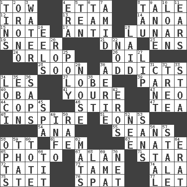 ACROSS 1. Pull behind 4. Singer James 8. Lie 12. Lyricist Gershwin 13. 480, 500 or 516 sheets of paper 14. Small Philippine buffalo 15. Brief written record 17. Against 18. Type of eclipse 19. Contemptuous expression 21. Heredity factor (abbr.) 23. Followers of ems 24. Fourth or lowest deck 26. Lubricate 28. Within a short period 30. Inveterate users 34. French article 37. Ear part 39. Role in a play 40. Chief or king in Benin or Nigeria 41. You are 43. Modern: prefix 44. 911 reaches them 46. Use a swizzle stick 47. Afternoon social gathering 48. Stimulate to action 51. Immeasurably long periods of time 54. Santa ___, CA 55. Seines 58. Baseball player Mel 61. Opposite of masc. 63. Maternal 65. Picture 67. Actor Alda or Thicke 71. Play the lead 72. Jacques of French films 73. Docile 74. Wing 75. Proofreading order 76. Petty quarrel 77. Allow DOWN 1. Airtight sealed metal containers 2. U. of Maine site 3. Wetness 4. Period 5. Nine, plus one 6. Make lace 7. Among 8. The 19th letter of the Greek alphabet 9. Queen of England 1702-14 10. Grant temporary use of 11. Hearing organs 16. Snakelike fish 18. Put down 20. Friend of Pooh 22. Allow head to fall sleepily 25. Much (prefix) 27. Mouth edge 29. Trap for birds or small mammals 30. Nest on high 31. Patter 32. Relationship diagram 33. Portico 34. Event scenes 35. Inky black, to poets 36. Plant excrements 38. Yet 42. Greek god of love 45. Health resort 49. A message received and understood 50. Actress Charlotte 52. Born 53. Without 56. Brizilian seaport 57. Showing deterioration from age 58. Chooses 59. Not this but _ 60. Carryall 62. Floor protectors 64. Part of Q.E.F. 66. Teat (slang) 68. Infant locale 69. Wet nurse (var.) 70. Fish or hair follower