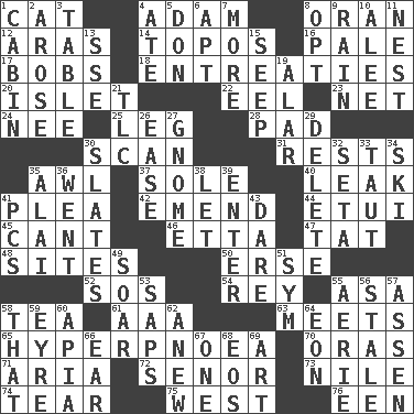 ACROSS 1. Feline 4. First man 8. Northwest Algerian city 12. Caspian sea tributary 14. Traditional theme or motif 16. Diluted with white 17. Moves up and down 18. Pleas 20. Small island 22. Snakelike fish 23. Fish or hair follower 24. Born 25. Part of a journey 28. Writing tablet 30. Examine hastily 31. Musical pauses 35. Leather borer 37. Not divided or shared with others 40. Path through which fluid escapes 41. Entreaty 42. Make improvements or corrections to 44. Needle holder 45. Patter 46. Singer James 47. Make lace 48. Settings 50. Celtic language 52. Mayday 54. Marina Del _, California 55. White ___ sheet 58. Afternoon social gathering 61. American Automobile Association (abbr.) 63. Confronts 65. Abnormally rapid or deep breathing 70. Mouths or openings 71. Roberta Peters solo 72. Sir (Sp.) 73. Mediterranean tributary 74. Separate forcefully 75. 270 degrees 76. Car or cant ending DOWN 1. Apartment or room in a ship 2. Came up 3. Eating place 4. Had dinner 5. Spanish title 6. Fitting 7. Greater amount 8. Choose 9. Water falling in drops from the sky 10. Toward shelter 11. Egg locale 13. Compass dir. 15. Ooze 19. Having or resembling wings 21. Affectionate concern, for short 26. Comfort 27. Dwarf 29. Keyboard key 30. Chalkboards 32. Stalk of a moss capsule 33. Pulled tight 34. What Jean-Claude Killy likes to do 35. Jai ____ 36. Gone 38. Allow 39. Keyboard key 41. Personal Computers (abbr.) 43. Have the gumption 49. Fly high 51. Symbol (abbr.) 53. Plant excrements 55. Nest on high 56. Showing deterioration from age 57. NE Netherlands city 58. Not this but _ 59. Jane of fiction 60. Capital of Western Samoa 62. Afresh 64. Period of immesurable duration 66. Ewer handle 67. Single 68. Greek goddess of the dawn 69. Tate display