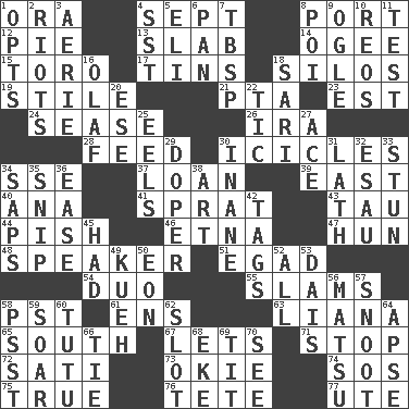 ACROSS 1. Mouth or opening 4. Back-to-school mo. 8. Sweet dark-red dessert wine 12. Sliced dessert 13. Thick slice 14. Double curve, resembling the letter S 15. "Corrida" creature 17. Canisters 18. Grain storage towers 19. Vertical member of a panel or frame 21. Parent Teacher Assoc. 23. Eastern Standard Time (abbr.) 24. Gospel singer Marvin 26. Lyricist Gershwin 28. Nourish 30. Winter's stalactites 34. Compass dir. 37. Grant temporary use of 39. Compass direction 40. Santa ___, CA 41. Small fatty European fish 43. The 19th letter of the Greek alphabet 44. Expression of disdain 46. Inactive volcano in Sicily 47. Attila the _ 48. Orator 51. Mild oath 54. Superhero pair 55. Shuts with force 58. Pacific Standard Time (abbr.) 61. Followers of ems 63. Woody, climbing, usually tropical plant 65. _ pole 67. Allows 71. Halt 72. Suttee (variant) 73. Migrant worker of the '30s 74. Mayday 75. Loyal 76. Wig 77. Shoshoni DOWN 1. Chooses 2. Disturbances 3. Nest on high 4. Fast jet (abbr.) 5. Biblical high priest 6. Baking dish 7. Cook's measure (abbr.) 8. Luau course 9. Stare 10. Vintage cars 11. Trial 16. Norwegian king 18. Indian skirt 20. Compass dir. 22. Nervous spasm 25. Snakelike fish 27. Adept person 29. Drug addict 30. Lacking in sense or substance 31. Thin strip of wood or metal 32. Son of Isaac 33. Surprise greatly 34. Plant excrements 35. Sever or remove by pinching or nipping 36. Comfort 38. Nonscientific branch of learning 42. Labels 45. Possessed 49. Malaysian steamed pastry 50. Period of immesurable duration 52. 100% 53. Raised platform 56. Taiwanese island in East China Sea 57. Snob 58. Inconspicuous attention getter 59. Fly high 60. Ballerina skirt 62. Narrow opening 64. Domed church section 66. Make a knot 68. Supplement with great effort 69. Teat (slang) 70. Perceive with the eye