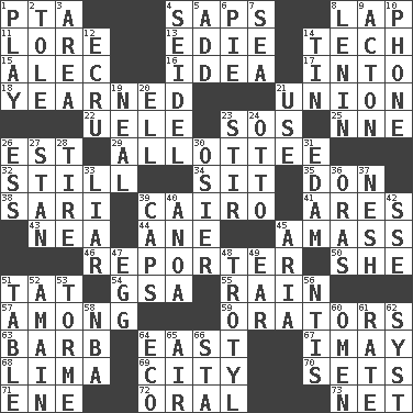 ACROSS 1. Parent Teacher Assoc. 4. Plant excrements 8. Pet locale 11. Old wives' tales, e.g. 13. Singer Brickell 14. Georgia ____ (Atlanta school) 15. Actor Baldwin 16. The content of cognition 17. To the inside or interior of 18. Felt deep pity or tenderness 21. The state of being joined or united 22. Ubangi River tributary 23. Mayday 25. Compass dir. 26. Eastern Standard Time (abbr.) 29. One to whom something is allotted 32. Free of sound 34. Be seated 35. Spanish title 38. Indian skirt 39. Capital of Egypt 41. Ancient Greek god of war 43. Teachers' org. 44. A saturated hydrocarbon 45. Collect or gather 46. News announcer 50. A female animal or person 51. Make lace 54. Girls' org. (abbr.) 55. Water falling in drops from the sky 57. Amid 59. Speakers 63. Sharp remark 64. 90 degrees 67. "If ____ say so..." 68. Pale green bean 69. Municipality 70. Puts into a specified state 71. Compass dir. 72. Relating to the mouth 73. Fish or hair follower DOWN 1. Romp 2. Lacquered or enameled metalware 3. Length times width 4. Beer mug 5. Say or write further 6. Sliced dessert 7. Ocean 8. Soviet premier 1918-24 9. 13-14th century defensive garment 10. Give a jingle 12. Shade of tan 14. Shallow baking pan 19. Be tempered by heat 20. Pipe bend 21. Purpose 23. Disorderly outburst 24. "Beetle Bailey" pooch 26. Double-curved letter 27. Comedian Laurel of Laurel & Hardy 28. Become fatigued 30. Flexible twig of a willow tree 31. Dutch treat 33. One who doesn't tell the truth 36. Mouths or openings 37. Tender 39. Smile enhancers 40. Small Philippine buffalo 42. Compass dir. 45. Operatic vocal solo 47. Oval reproductive body of a fowl 48. TNT 49. Hearing organ 51. Eating place 52. At full speed 53. Singer Mel 56. Nuclear Threat Initiatives 58. Basketball assoc. 60. Sign of things to come 61. Pace 62. System (abbr.) 64. Environmental prefix 65. Wind 66. R.R. building