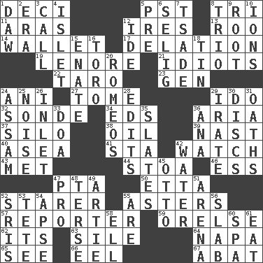 ACROSS 1. Tenth: prefix 5. Pacific Standard Time (abbr.) 8. Three (prefix) 11. Ancient river in northeast Turkey 12. Angers 13. Friend of Pooh 14. Place for singles 17. Accusation by an informer 19. Poe poem 21. Foolish or stupid persons 22. Pacific island yam 23. Commissioned mil. rank 24. Black tropical American cuckoo 27. Heavy book 29. Wedding promise 32. Message 34. Begley and Asner 36. Roberta Peters solo 37. Grain storage tower 38. Petroleum 39. Political cartoonist Thomas 40. Toward the sea 41. R.R. building 42. Observe 43. Was introduced to 44. Portico 46. Curvy letter 47. Parent Teacher Assoc. 50. Singer James 52. A viewer who gazes fixedly 55. Michaelmas daisies 57. News announcer 59. Threatening words 62. ___ a Wonderful Life 63. Drop; flow; fall 64. California wine valley 65. Perceive with the eye 66. Snakelike fish 67. Blind as ____ DOWN 1. Obsolete 2. Period 3. Give a ring to 4. Small island 5. Before (prefix) 6. Former Milwaukee Brewers owner Bud 7. Sadhe (variant) 8. Musical group of three 9. Carrot, for example 10. Charged particles 12. Binary compound 15. Maternal 16. "Corrida" creature 18. Metal container 20. Lover boys 24. Indian state 25. Annoying sound 26. An arm off of a larger body of water 28. Proofreads 29. Feeling or showing extreme anger 30. Flat circles 31. Curses 33. ___ good deed 35. Chalkboards 36. Santa ___, CA 42. Wetness 45. Von Bismarck 47. Adept person 48. Laconic 49. Nick name for Arthur 51. Sports stadium 52. Indian titles of respect 53. False hair 54. Domed church section 55. "We ___ not amused" (Victoria) 56. Broad, flat, thick piece 58. Pipe bend 60. Health resort 61. Ingest