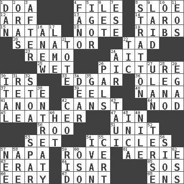 ACROSS 1. ___ good deed 4. Do some clerical work 8. A type of plum 12. Sandy's bark 13. Grows older 14. Edible starchy tuberous root 15. Brizilian seaport 18. Short letter 19. Teases 20. Elected representative 22. Bit 23. San ____ (Riviera town) 24. Small island 25. Dripping 26. Photo 30. Big collection agency 33. _ Allan Poe 36. Cassini of fashion 37. False hair 39. Snakelike fish 40. Nanny 41. At once, immediately (arch.) 42. 2nd pers. sing. pres. of can (arch.) 44. Allow head to fall sleepily 45. Cordwainer's material 47. The 18th letter of the Arabic alphabet 50. Friend of Pooh 51. A single undivided whole 53. Put into a specified state 54. Winter's stalactites 57. California wine valley 59. Be footloose 61. Nest on high 63. Part of Q.E.F. 64. Austrian river, tributary to the Danube 65. Mayday 66. Suggestive of the supernatural 67. Do not 68. Followers of ems DOWN 1. One of the 12 tribes of Israel 2. Mouths or openings 3. Following 4. Papal veil 5. Composer Stravinsky 6. Allow 7. Compass dir. 8. Ski resort town in Vermont 9. Put down 10. Globe 11. Greek goddess of the dawn 16. Afresh 17. Unable to walk 21. Lug 22. Nervous spasm 24. Atmosphere 26. Friends 27. ____ Bator, Mongolia 28. Western Nevada city 29. Mild oath 30. Slanted text style (abbr.) 31. French philosopher Descartes 32. Portico 34. Letter starter 35. Commissioned military rank (abbr.) 38. Plea 42. Corporate head (abbr.) 43. "Change" in Tahitian 46. Being at a high temperature 48. South American Indian 49. The longest river in the world 52. Laconic 53. Coast Guard woman 54. _ the terrible 55. Sure thing 56. The Jewish people; Israel 57. Born 58. "We ___ not amused" (Victoria) 59. To free from 60. Bear (Spanish) 62. Curvy letter