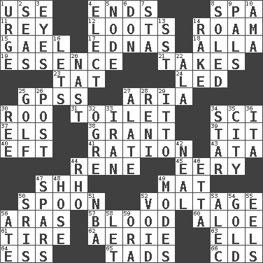 ACROSS 1. Purpose 4. Conclusions 8. Health resort 11. Marina Del _, California 12. Plunders 14. Wander aimlessly 15. Highlander 17. Ferber et al. 18. Silent film actress Nazimova 19. Substance 21. Proceeds 23. Make lace 24. Directed 25. Global Positioning Systems (abbr.) 27. Roberta Peters solo 30. Friend of Pooh 31. Bathroom 34. _-fi 37. Raised railways 38. Monetary aid 39. Teat (slang) 40. Newt 41. Food allowance for one day 43. _ moment's notice (2 wds.) 44. French philosopher Descartes 45. Suggestive of the supernatural 47. Quiet! 49. Floor protector 50. Soup utensil 52. Electrical Measurement 56. Caspian sea tributary 57. Vital fluid 60. Medicinal plant 61. Hoop that covers a wheel 62. Nest on high 63. Pipe bend 64. Curvy letter 65. Small amounts or degrees 66. Music discs DOWN 1. Goad 2. Oceans 3. Snake ____ (dice throw) 4. Voters do this 5. Thickened enlargement 6. Spanish title 7. R.R. building 8. Having a sole or soles 9. Friends 10. Wet nurse (var.) 13. Fast jet (abbr.) 14. Libertine 16. Allows 20. Political cartoonist Thomas 22. According to 25. Eighteen holes 26. Mail 27. Having winglike extensions 28. Painter Guido (1575-1642) 29. "Tell ____ the Marines!" 30. To separate or throw off 32. Legendary monster 33. SW Asia republic 34. Play the lead 35. Municipality 36. Call ___ day 42. Anneal 44. 17th letter of the Greek alphabet 46. Singer James 47. Practice fights 48. Flexible conduit 49. Methods 50. Indian titles of respect 51. Basketball assoc. 52. Nothingness 53. Actor Baldwin 54. Precious metal 55. Snakelike fish 56. Had dinner 58. Allow 59. Mouth or opening