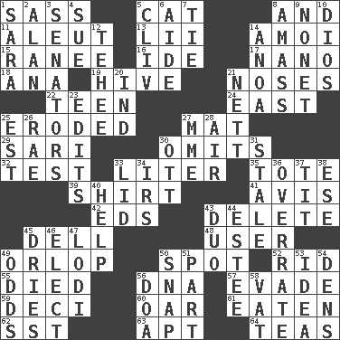 ACROSS 1. Backtalk 5. Feline 8. Added to 11. Native American of Southwest Alaska 13. Cards in a Roman deck? 14. Mine, in Marseilles 15. Indian princess (variant) 16. Binary compound 17. Billionth: prefix 18. Santa ___, CA 19. Hub of activity 21. Olfactory organs 22. Adolescent 24. 90 degrees 25. Worn away 27. Floor protector 29. Indian skirt 30. Leaves out 32. Trial 33. 61 cubic inches 35. Haul 39. Chest covering 41. Advice 42. Begley and Asner 43. Erase 45. Small valley 48. One who makes use of a thing 49. Lowest deck of a ship 50. Blemish 52. To free from 55. Passed on 56. Heredity factor (abbr.) 57. Elude 59. Tenth: prefix 60. Rowing implement 61. Ingested 62. Fast jet (abbr.) 63. Fitting 64. Afternoon social gatherings DOWN 1. "Two Mules for Sister ____" 2. ____ Jay Lerner 3. Legislators 4. Institute legal proceedings 5. 154 in Roman numerals 6. Helper 7. Standoff 8. Collect or gather 9. Music written for nine 10. "Vaya con ____" 12. Giggle 14. Small Philippine buffalo 20. Indiana (abbr.) 21. Remaining after all deductions 23. Prepares for publication 25. Eastern Standard Time (abbr.) 26. Actress Charlotte 27. Madame (abbr.) 28. Wind 30. Baseball player Mel 31. Lacking originality or spontaneity 33. Flaplike covering 34. Big collection agency 36. Make much ado about nothing 37. Teat (slang) 38. Compass dir. 40. Aid 43. Superhero pair 44. First name in cosmetics 45. Frees from moisture 46. Opt 47. Farming town in central California 49. Probability 50. Fastener 51. Piece 53. The content of cognition 54. Habitations of wild animals 56. ___ good deed 58. Large container