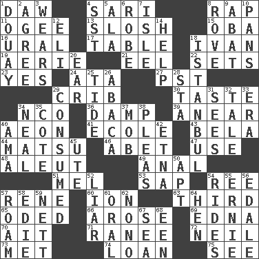 ACROSS 1. Simpleton 4. Indian skirt 8. Reproach for some lapse or misdeed 11. Double curve, resembling the letter S 13. Splash clumsily 15. Chief or king in Benin or Nigeria 16. Mountain range 17. Eating place 18. _ the terrible 19. Nest on high 21. Snakelike fish 22. Puts into a specified state 23. Consenting reply 24. "One Day ___ Time" 27. Pacific Standard Time (abbr.) 29. Baby bed with high sides 30. Clothes sense 34. Non-commissioned officer (abbr.) 36. Moist 39. Approach 40. A really long time 41. Learning spot: Fr. 43. Actor Lugosi 44. Taiwanese island in East China Sea 46. Collude with 47. Purpose 48. Eskimo relative 49. Of or related to the anus 51. Cartoonist voice _ Blanc 53. Plant excrement 54. Portuguese money of account (variant) 57. French philosopher Descartes 60. Electrically charged atom 63. One of three equal parts 65. Wrote a lyric poem 66. Came up 69. Pulitzer Prize-winning author Ferber 70. Small island 71. The wife of a rajah (variant) 72. Famous astronaut Armstrong 73. Was introduced to 74. Grant temporary use of 75. Perceive with the eye DOWN 1. A city in N France, SE of Calais 2. Match 3. Puts on (as clothing) 4. Fast jet (abbr.) 5. In the manner of 6. Loose flowing garment 7. Small island 8. Be footloose 9. Blind as ____ 10. Baking dishes 12. Biblical high priest 14. Aid 18. Byzantium, centuries later 20. Ewer handle 25. Periodic rise and fall of the sea level 26. Phillipine bananalike plant 28. R.R. building 29. Ingested 31. Perceives with the eye 32. Falsehood 33. Epoch 34. Actress Patricia 35. ____ d'Azur (French Riviera) 37. Disorderly crowd 38. Entreaties 40. Nursemaid (var.) 42. Inactive volcano in Sicily 45. Shoshoni 50. Fitting 52. One who doesn't tell the truth 54. Amusement-park features 55. Bert's buddy 56. Peak District village in England 57. Wander 58. Singer Brickell 59. Remaining after all deductions 61. Relating to the mouth 62. Words to Nanette 64. Layer 67. Ocean 68. Car or cant ending