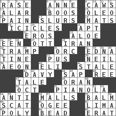 ACROSS 1. Raze (variant) 5. Singer Murray 9. Crow sounds 13. Having or resembling wings 14. Scornful sounds 15. Margarine 16. Ache 17. Plays smoothly or legato 18. Floor coverings 19. Winter's stalactites 21. Fitting 22. Greek god of love 23. _ vera 24. Car or cant ending 27. Baseball player Mel 28. SW Asia republic 29. _____ steamer (cargo ship) 31. The grampus (Milton) 32. Pulitzer Prize-winning author Ferber 36. Prong on a fork 37. Fluid product of inflammation 38. Famous astronaut Armstrong 39. A really long time 40. Biblical high priest 41. Showing deterioration from age 42. _ Jones' Locker 44. Plant excrement 46. To separate or throw off 47. Lie 48. NW Algerian seaport 50. Sep. follower 51. Player piano 54. Opposed to 56. Promenades 58. Lip ointment 60. Get outta here! 61. Double curve, resembling the letter S 62. Pale green bean 63. More than one (prefix) 64. Necklace unit 65. Part of Q.E.F. DOWN 1. Reproach for some lapse or misdeed 2. Mountain range southwest of Kyrgyzstan 3. Ketch in the Levant 4. Bert's buddy 5. Most capable 6. Good sense 7. Or not 8. Curvy letter 9. Part 10. Having winglike extensions 11. Dripping 12. Distress signal 17. Notch 20. Riding implement 21. Insect wing 23. Curve 24. Singer James 25. One of the Great Lakes 26. Billionth: prefix 28. Big collection agency 30. Ananias' fault 31. Fr. "Yes" 33. Letter starter 34. Mediterranean tributary 35. Toward shelter 37. Travel a route regularly 40. Night before a holiday 41. Connect, as a bridge 43. Keyboard modifier key 44. Dirtied 45. Caspian sea tributary 47. "_____ Recall" 49. Having high moral qualities 51. Entreaty 52. Den 53. _ mater 54. Cleo's killer 55. Non-commissioned officer (abbr.) 56. Crowd into 57. Grow older 59. Floor covering