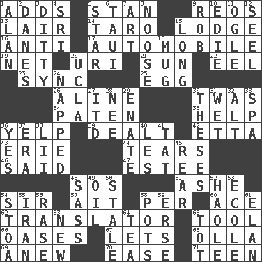 ACROSS 1. Does sums 5. Comedian Laurel of Laurel & Hardy 9. Vintage cars 13. Den 14. Pacific island yam 15. Cabin 16. Against 17. Form of transportation 19. Fish or hair follower 20. RI univ. 21. Player for Phoenix 22. Snakelike fish 23. Synchronize (abbr.) 25. Oval reproductive body of a fowl 26. Place in a line 30. It was, poetically 34. Eucharist need 35. Aid 36. Sharp bark 39. Started a card game 42. Singer James 43. One of the Great Lakes 44. Separates forcefully 46. Alleged 47. First name in cosmetics 48. Mayday 51. American tennis player Robert 54. Title for a knight 57. Small island 58. For each 60. Adept person 62. Interpreter 65. Implement 66. Fertile tracts in a desert 67. Allows 68. Rounded earthenware pot or jar 69. Afresh 70. Relaxation 71. Adolescent DOWN 1. ____ Jay Lerner 2. Natives or inhabitants of Denmark 3. Simple song 4. Indian title of respect (Mr.) 5. Play the lead 6. "Change" in Tahitian 7. Tate display 8. Trap for birds or small mammals 9. Director Reiner 10. Singer Brickell 11. Stare at amorously 12. Sew up the eyelids of hawks and falcons 15. Having great length 18. Large cup 20. Southern CA. univ. 24. Slept 27. It would 28. Born 29. Maternal 30. College papers 31. Dripping 32. Keyboard modifier key 33. Health resort 36. Affirmative reply 37. Period 38. Cards in a Roman deck? 40. French article 41. Make lace 45. Rump 48. Backtalk 49. Petroleum 50. Lacking originality or spontaneity 52. White Person, in Hawaii 53. Learning spot: Fr. 54. Portico 55. SW Asia republic 56. Raze (variant) 58. Plant holders 59. Celtic language 61. Style 63. ___ Haven, CT 64. Beverage made from leaves 65. Small child