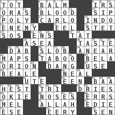 ACROSS 1. Small child 4. Lip ointment 8. Big collection agency 11. Mouths or openings 13. Vital fluid 15. Small drink 16. Much (prefix) 17. Monte _, Las Vegas Hotel/Casino 18. _ china 19. Foe 21. Snakelike fish 22. Proofreading order 23. Distress signal 24. Followers of ems 27. Make lace 29. Toward the sea 30. Clothes sense 34. Pat or tap gently 36. Messy guy 39. Approach 40. Atlas contents 41. Off limits 43. Actor Lugosi 44. Greek mythologigal hunter 46. Mild oath, euphamism for damn 47. Purpose 48. Calif. Air Force Base 49. Anneal 51. Shoshoni 53. Car or cant ending 54. Sound made by sheep 57. Behest 60. Three (prefix) 63. Frees from moisture 65. Migrant worker of the '30s 66. Olfactory organs 69. Blunders 70. Cartoonist voice _ Blanc 71. Assad's deity 72. Singer Brickell 73. Compass dir. 74. Suggestive of the supernatural 75. Elected rep. DOWN 1. Drinks excessively 2. U. of Maine site 3. Stories 4. English channel? 5. In the manner of 6. Old wives' tales, e.g. 7. Undercover agent 8. Is not 9. Travel on an animal 10. Specific locale 12. Symbol (abbr.) 14. Dunce 18. Byzantium, centuries later 20. It is so 25. Egg locale 26. Vegetable dish 28. _ moment's notice (2 wds.) 29. Utter; complete 31. Observes 32. Lie 33. Epoch 34. Have the gumption 35. Capital of Western Samoa 37. Chief or king in Benin or Nigeria 38. Child's nurse 40. Disorderly crowd 42. Double curve, resembling the letter S 45. Fish or hair follower 50. Added to 52. Inactive volcano in Sicily 54. Avian creatures 55. Nest on high 56. NE Netherlands city 57. Residence 58. Supplements with great effort 59. Drop; flow; fall 61. Hero or heavy, e.g. 62. Capri or Wright 64. Portuguese money of account (variant) 67. Ewer handle 68. Like a shrinking violet
