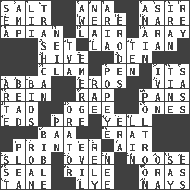 ACROSS 1. Table seasoning 5. Santa ___, CA 8. SW Saudi Arabia district 12. Independent ruler or chieftain 13. We are 15. Female horse 16. Bee-related 18. Den 19. Like ___ of sunshine 20. Arrange properly for use 22. Of or relating to Laos or its people 24. Hub of activity 26. Lair 27. Burrowing marine mollusk 28. Fenced enclosure 29. ___ a Wonderful Life 32. Swedish rock group 35. Greek god of love 37. By way of 38. It's straight from the horse's mouth 39. Reproach for some lapse or misdeed 40. Baking dishes 41. Bit 42. Double curve, resembling the letter S 43. Singles 44. Begley and Asner 45. Before (prefix) 46. Shout 49. Sound made by sheep 50. Part of Q.E.F. 51. Hard copy producer 55. Wind 56. Oscar Madison type 57. Baking chamber 59. Trap for birds or small mammals 63. Lick closed 64. Cause heat under the collar 65. Mouths or openings 66. Docile 67. Sodium hydroxide 68. Negative votes DOWN 1. Ocean 2. Electrical Unit 3. Cards in a Roman deck? 4. File 13 5. Leather borer 6. Be tempered by heat 7. Operatic vocal solo 8. With great haste 9. "Two Mules for Sister ____" 10. SW Asia republic 11. Marina Del _, California 14. Eats (away) 17. Famous astronaut Armstrong 21. Federal power corp. 23. "___ Little Indians" 25. Develop 28. Wimpy's pal 29. _ the terrible 30. Prong on a fork 31. Backtalk 32. Johnson of "Laugh-In" 33. Necklace unit 34. Auction offers 36. Actress Charlotte 40. Coward 42. Speaker 45. Baking dish 47. Epoch 48. (Had) reclined 49. God's Word 51. Entreaty 52. Wander 53. Morally bad or wrong 54. Depend 56. Fast jet (abbr.) 58. Born 60. Mouth or opening 61. Declare 62. Curvy letter