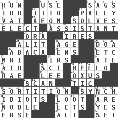 ACROSS 1. Attila the _ 4. Purpose 7. Sinks 11. Wedding promise 12. "Tell ____ the Marines!" 13. Chummy 14. Large container 15. Period of immesurable duration 16. Finds the solution 17. Voters do this 19. Aide 21. Mouth or opening 23. Angers 24. Set down 25. Ripen 26. ___ good deed 29. Phillipine bananalike plant 30. Followers of ems 31. And so on (abbr.) 32. Medical imaging device (abbr.) 33. Big collection agency 34. Had dinner 35. Assist 36. _-fi 37. Phone greeting 40. Actress Charlotte 41. Area sheltered from the wind 42. Amu Darya 43. Skim 45. Nervous spasm 46. Drawing lots 51. Synchronize (abbr.) 55. Foolish or stupid persons 56. Plunder 58. "We ___ not amused" (Victoria) 59. Impressive in appearance 60. Allows 61. Consenting reply 62. Celtic language 63. The first octave above the treble staff 64. Put into a specified state DOWN 1. Hub of activity 2. Allodial 3. Observe 4. Shoshoni 5. Portico 6. Immeasurably long periods of time 7. Table seasonings 8. Inventor's middle name 9. Small, secluded valley 10. System (abbr.) 12. Of or pertaining to medicine 13. Airs 16. Male parents of animals 18. Root beer relative 20. Attaches a signature 22. _ moment's notice (2 wds.) 24. Stay 25. Nest on high 26. Allots cards 27. Von Bismarck 28. Adept person 29. Roberta Peters solo 32. Impair 33. Ancient Celtic tribe of eastern Britain 36. Narrow boards 37. Being at a high temperature 38. Is 39. "I Love _" 43. Took without asking 44. Quote 46. Trig term 47. Aroma 48. Chest bones 49. Water jar 50. Christmas carol 52. Negative votes 53. Algonquian 54. Command 57. Baseball player Mel