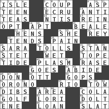 ACROSS 1. Capri or Wright 5. Clever action or accomplishment 9. Viper 12. Adolescent 13. Shade of tan 14. Against 15. Beverages made from leaves 16. Nuclear Threat Initiatives 17. It's straight from the horse's mouth 18. Choose 19. Fitting 21. Memphis, Tenn. Street 22. Coop moms 24. A female animal or person 26. Marina Del _, California 27. Watches over 28. Ache 29. "Two Mules for Sister ____" 30. For Whom the Bell _____ 32. Comedian Laurel of Laurel & Hardy 36. Proofreading order 37. Dripping 38. Drink excessively 39. Periodic rise and fall of the sea level 40. Suffix with ecto or cyto 42. To erase 43. Leaves 44. Remain 46. Spanish title 49. Baseball player Mel 50. Republicans 51. U. of Maine site 53. _ de Janeiro 54. Pull behind 57. Rights 58. Length times width 61. Root beer relative 62. _ course 63. Australian parrot (variant) 64. Stupid person 65. Compass dir. 66. Grant temporary use of 67. Narrow board DOWN 1. "Tell ____ the Marines!" 2. Ooze 3. Tough but pliablecoriaceous 4. Followers of ems 5. Penny 6. Sep. follower 7. RI univ. 8. Fluid product of inflammation 9. Approach 10. Vertical member of a panel or frame 11. Abounding in pines 14. "We ___ not amused" (Victoria) 19. Also 20. Inconspicuous attention getter 21. Benjamin's nick name 23. Maternal 24. Table seasonings 25. Part of HMS, perhaps 27. Jacques of French films 28. Entreaties 29. Fast jet (abbr.) 31. A small or young owl 32. Empty completely 33. Inedible or poisonous agaric 34. Domed church section 35. Born 40. Plant holder 41. Wise men 43. Thick or sticky substance 45. Sometimes accompanies a hiss 46. Evade 47. Greek mythologigal hunter 48. Impressive in appearance 52. Science/research agcy. 53. Water falling in drops from the sky 55. Rounded earthenware pot or jar 56. Electrical Unit 58. Everything 59. Friend of Pooh 60. Period 61. Music discs