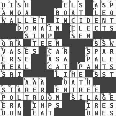 ACROSS 1. Food container 5. Raised railways 8. Cleo's killer 11. Small Philippine buffalo 12. Water vessel 13. Lion 14. Place for singles 17. Happening 19. Realm 21. Chooses 22. Simple or foolish person 23. Elected rep. 24. Mouth or opening 27. Adolescent 29. Compass dir. 32. Flower holders 34. Automobile 36. Practice fight 37. Celtic language 38. White ___ sheet 39. Light colored 40. Anneal 41. Domesticated feline 42. Leg coverings 43. _ Lanka 44. Welles in "The Third Man" 46. Fast jet (abbr.) 47. Auto club (abbr.) 50. Pledge 52. A viewer who gazes fixedly 55. Main course 57. Coward 59. Fodder prepared in a silo 62. Epoch 63. Naughty children 64. Angers 65. Spanish title 66. Ingest 67. Washington bills DOWN 1. Fool 2. _ tizzy (2 wds.) 3. Exchanged or delivered for money 4. Saint headwear 5. Age 6. Shoestrings 7. Vertical member of a panel or frame 8. Actor Baldwin 9. Posted 10. Cooking vessels 12. Storage container 15. Sends forth 16. Not wild 18. Lair 20. Medicinal drug used to evoke vomiting 24. Baking chambers 25. More uncommon 26. Slender Brazilian palm 28. Rhinal 29. Connects, as a bridge 30. Table seasonings 31. Take or capture by force 33. Snakelike fish 35. Food allowance for one day 36. Health resort 42. _ dish (used to culture cells) 45. Floor coverings 47. Tate display 48. Nest on high 49. Odor 51. Sun: prefix 52. Moved rapidly 53. "Corrida" creature 54. Actor Alda or Thicke 55. Followers of ems 56. Merit 58. Choose 60. Unit of force equal to gravity 61. Double-curved letter