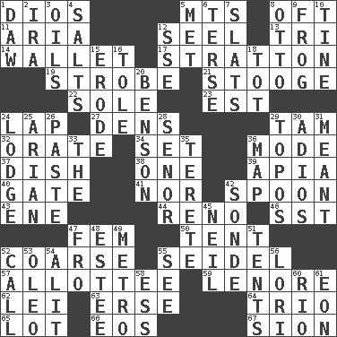 ACROSS 1. "Vaya con ____" 5. Mountains (abbr.) 8. Often (poetically) 11. Roberta Peters solo 12. Sew up the eyelids of hawks and falcons 13. Three (prefix) 14. Place for singles 17. Ski resort town in Vermont 19. Disco prop 21. Moe Howard, for one 22. Not divided or shared with others 23. Eastern Standard Time (abbr.) 24. Pet locale 27. Cub Scout units 29. Scottish cap 32. Declaim 34. Put into a specified state 36. Method 37. Food container 38. Single 39. Capital of Western Samoa 40. Yard entry 41. Or not 42. Soup utensil 43. Compass dir. 44. Former U.S. Attorney General Janet 46. Fast jet (abbr.) 47. Opposite of masc. 50. Portable shelter 52. Rough 55. Beer mug 57. One to whom something is allotted 59. Poe poem 62. Luau accessory 63. Celtic language 64. Musical group of three 65. Car dealer's back yard 66. Greek goddess of the dawn 67. The Jewish people; Israel DOWN 1. Simpleton 2. Retirement account (abbr.) 3. Lubricates 4. Table seasonings 5. Was introduced to 6. Laconic 7. Narrow boards 8. Von Bismarck 9. Toadlike animal 10. Prong on a fork 12. Compass dir. 15. Wear away 16. Lacquered or enameled metalware 18. Small child 20. Gillaume's butler role 24. Cabin 25. Believer in; advocate of (suffix) 26. Thick mixture 28. Sir (Sp.) 29. Traditional theme or motif 30. Goodbye (Sp.) 31. Intended 33. Definite Article 35. Cylindrical with tapered ends 36. Atlas unit 42. Message 45. Famous astronaut Armstrong 47. From 48. First name in cosmetics 49. Paris' subway 51. Portable shelters 52. Give a ring to 53. Margarine 54. Set down 55. Perceive with the eye 56. Australian parrot (variant) 58. Double-curved letter 60. _ de Janeiro 61. Period of immesurable duration