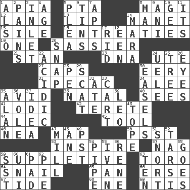 ACROSS 1. Capital of Western Samoa 5. Parent Teacher Assoc. 8. Wise men 12. Long (Scottish) 13. Mouth edge 14. French painter Edouard 15. Drop; flow; fall 16. Pleas 19. Single 20. More disrespectful 21. Comedian Laurel of Laurel & Hardy 23. Heredity factor (abbr.) 24. Shoshoni 27. Balmoral and tarboosh 30. Suggestive of the supernatural 31. Medicinal drug used to evoke vomiting 34. Toward shelter 35. Enthusiastic 38. Brizilian seaport 40. Observes 41. Farming town in central California 42. Cylindrical with tapered ends 44. Actor Baldwin 45. Instrument 46. Teachers' org. 47. Atlas unit 50. Inconspicuous attention getter 53. Motivate 57. Tired old horse 59. Supplying deficiencies 63. "Corrida" creature 64. Slow-paced one 65. Baking dish 66. Celtic language 67. Periodic rise and fall of the sea level 68. Compass dir. 69. Nuclear Threat Initiatives DOWN 1. In addition 2. Aches 3. An arm off of a larger body of water 4. Ripen 5. Entreaty 6. Canisters 7. Flats, for short 8. Floor covering 9. Cuckoo 10. Turn to the right 11. ___ a Wonderful Life 14. Hindu Mythology: god of death 17. To free from 18. Car or cant ending 20. Fastener 22. Being or containing an acid 24. Ubangi River tributary 25. Woody plant 26. Sight organs 28. Writing instrument 29. Get outta here! 30. Artist's stands 32. Had dinner 33. Draw slowly or heavily 35. Actor Alda or Thicke 36. Short-tailed, large-bodied rat 37. The main thing one is thinking about 39. Lion 43. Drink excessively 47. Place where flour is made 48. One (Scot) 49. Pacific Standard Time (abbr.) 51. Derisive sound 52. Tarsus (plural) 54. Corncob 55. _ the terrible 56. French philosopher Descartes 58. Travels 59. Fast jet (abbr.) 60. University (slang) 61. Writing tablet 62. Sliced dessert 63. Nine, plus one