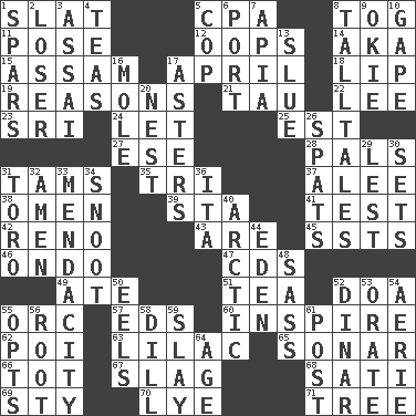 ACROSS 1. Narrow board 5. Tax preparer (abbr.) 8. Coat; cloak 11. Airs 12. I made a mistake 14. Alias (abbr.) 15. Indian state 17. Showery time 18. Mouth edge 19. Thinks logically 21. The 19th letter of the Greek alphabet 22. Area sheltered from the wind 23. _ Lanka 24. Allow 25. Eastern Standard Time (abbr.) 27. Compass dir. 28. Friends 31. Scottish caps 35. Three (prefix) 37. Toward shelter 38. Sign of something about to happen 39. R.R. building 41. Trial 42. Western Nevada city 43. "We ___ not amused" (Victoria) 45. Fast planes 46. Southwest Nigerian state 47. Music discs 49. Had dinner 51. Afternoon social gathering 52. ___ good deed 55. The grampus (Milton) 57. Begley and Asner 60. Motivate 62. Luau course 63. Pale purple color 65. Underwater navigation system 66. Small child 67. Volcanic refuse 68. Suttee (variant) 69. Filthy place 70. Potassium hydroxide 71. Woody plant DOWN 1. Practice fights 2. Failure 3. Slender Brazilian palm 4. Beverages made from leaves 5. Police officer (slang) 6. Sweet dark-red dessert wine 7. Capital of Western Samoa 8. Baron Munchausen's specialties 9. Migrant worker of the '30s 10. Yawn 13. Turn sharply 16. Undercover agent 17. Michaelmas daisies 20. Egg locale 26. Arguments over trivial matters 29. For fear that 30. Arranges properly for use 31. "Corrida" creature 32. So be it 33. Ananias' fault 34. Snob 36. Call ___ day 40. Northern region 44. Paradise 48. Backtalk 50. Snakelike fish 52. Middle Eastern gold or silver currency 53. Speak pompously 54. Nest on high 55. Elects 56. Carrot, for example 58. Deli pickle 59. Kill 61. Mail 64. Grow older