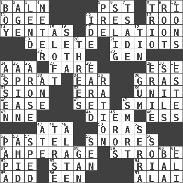 ACROSS 1. Lip ointment 5. Pacific Standard Time (abbr.) 8. Three (prefix) 11. Double curve, resembling the letter S 12. Angers 13. Friend of Pooh 14. Gossips 17. Conveyance 19. Erase 21. Foolish or stupid persons 22. Writer of Portnoy's Complaint (1969) 23. Commissioned military rank (abbr.) 24. American Automobile Association (abbr.) 27. Conductor's collection 29. Compass dir. 32. Small fatty European fish 34. Ewer handle 36. Pate de foie ____ 37. The Jewish people; Israel 38. Epoch 39. A single undivided whole 40. Relaxation 41. Arrange properly for use 42. Grin 43. Compass dir. 44. South Vietnam president (1954) 46. Double-curved letter 47. _ moment's notice (2 wds.) 50. Mouths or openings 52. Soft color 55. Sounds asleep 57. Electrical Measurement 59. Disco prop 62. Sliced dessert 63. Comedian Laurel of Laurel & Hardy 64. Monetary unit of Yemen 65. Say or write further 66. Car or cant ending 67. Mountain range southwest of Kyrgyzstan DOWN 1. Male child 2. Grow older 3. Grant temporary use of 4. Distance measurement 5. Before (prefix) 6. Former Milwaukee Brewers owner Bud 7. Sadhe (variant) 8. Musical group of three 9. Carrot, for example 10. Charged atoms 12. Binary compound 15. Upward 16. Stalk of a moss capsule 18. Metal container 20. Triads 24. NE Netherlands city 25. Bee-related 26. Came up 28. Having ears or earlike features 29. Bert's buddy 30. Travel by water 31. _____ Park, CO 33. One (Scot) 35. Food allowance for one day 36. Chewing product 42. Don Adams' spy role 45. Greek god of love 47. Had dinner 48. Laconic 49. Having winglike extensions 51. Father Junipero _ 52. Dad 53. Among 54. Drove too fast 55. Elected rep. 56. Land 58. Separate the seeds from cotton 60. Sound made by sheep 61. Connecticut Ivy Leaguer