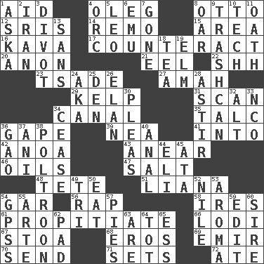 ACROSS 1. Help 4. Cassini of fashion 8. Von Bismarck 12. Indian titles of respect 14. San ____ (Riviera town) 15. Type of rug 16. Polynesian shrub of the pepper family 17. Frustrate 20. At once, immediately (arch.) 21. Snakelike fish 22. Quiet! 23. Sadhe (variant) 27. Wet nurse 29. Seaweed 31. Glance over 34. Lessep's creation 35. Baby powder 36. Stare wonderingly 39. Teachers' org. 41. To the inside or interior of 42. Small Philippine buffalo 43. Approach 46. Lubricates 47. Table seasoning 48. Wig 51. Woody, climbing, usually tropical plant 54. Slender fish 56. Reproach for some lapse or misdeed 58. Angers 61. Appease 66. Farming town in central California 67. Portico 68. Greek god of love 69. Arab leader 70. Transmit 71. Puts into a specified state 72. Had dinner DOWN 1. "____ silly question..." 2. SW Asia republic 3. A piece of turf (Scot.) 4. The grampus (Milton) 5. Lion 6. Australian flightless bird 7. Went 8. Boat paddle 9. File 13 10. Technical 11. Pledge 13. Without 18. Afternoon social gathering 19. Shade tree 24. Alias (abbr.) 25. Lair 26. Enthusiasm 28. Moving or stirring 30. Entreaties 32. The first octave above the treble staff 33. Non-commissioned officer (abbr.) 34. Desist 36. E Mali city 37. Black tropical American cuckoo 38. Characterized by complete cowardliness 40. Of or related to the anus 44. Biblical high priest 45. _ moment's notice (2 wds.) 49. Three (prefix) 50. Ingest 52. Mediterranean tributary 53. Odor 54. Global Positioning Systems (abbr.) 55. Johnson of "Laugh-In" 57. Sliced desserts 59. Prepare for publication 60. Title for a man of rank and authority 62. Writing tablet 63. "We ___ not amused" (Victoria) 64. Small child 65. Double-curved letter