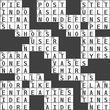 ACROSS 1. Sliced dessert 4. Mail 8. Proofreading order 12. _ china 14. At sea 15. Ubangi River tributary 16. Inactive volcano in Sicily 17. Unrelated to defense, as in spending 20. Narrow board 21. "Barney Miller" actor Jack 22. Animal enclosure 23. Imelda's hoard 27. Olfactory organ 29. One who uses or employs something 31. Leg joint 34. Sibling's daughter 35. Lodging establishments 36. "Two Mules for Sister ____" 39. Make lace 41. Sight organs 42. Singles 43. Flower holders 46. California wine valley 47. Independent ruler or chieftain 48. Rounded earthenware pot or jar 51. Arguments over trivial matters 54. Not either 56. Eisenhower's nickname 58. Liveliness 61. Pleas 66. Grandmother 67. The main thing one is thinking about 68. Prong on a fork 69. Airtight sealed metal containers 70. Old wives' tales, e.g. 71. Helper 72. Fish or hair follower DOWN 1. Sliced desserts 2. International (abbr.) 3. Ferber et al. 4. Baking dish 5. Bear (Spanish) 6. Elected rep. 7. Small amounts or degrees 8. Take to court 9. 3-inch nail 10. Otherwise 11. Adolescent 13. Pledge 18. A really long time 19. Egg _ yung 24. Fr. "Yes" 25. Compass dir. 26. Religious group 28. Atmospheres 30. Rob, plunder, or pillage 32. Compass dir. 33. Curvy letter 34. Relating to the nose 36. Boy, to dad 37. Santa ___, CA 38. News announcer 40. Scottish caps 44. Small drink 45. Period 49. Untruth 50. Alias (abbr.) 52. Portable shelter 53. Killed 54. Famous astronaut Armstrong 55. Southwest Nigerian state 57. Singer James 59. Singer Murray 60. Political cartoonist Thomas 62. Actress Charlotte 63. One more than two 64. Conclusion 65. Observe