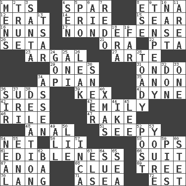 ACROSS 1. Mountains (abbr.) 4. Practice fight 8. Inactive volcano in Sicily 12. Part of Q.E.F. 14. 4th largest of the Great Lakes 15. Wither 16. Religious women 17. Unrelated to defense, as in spending 20. Bristle 21. Mouth or opening 22. Parent Teacher Association (abbr.) 23. Therefore, facetiously 27. Johnson of "Laugh-In" 29. Singles 31. Southwest Nigerian state 34. Bee-related 35. Soon (poet.) 36. Beer foam 39. A weed 41. Centimeter-gram-second unit of force 42. Angers 43. Poet Dickinson 46. Cause heat under the collar 47. Immoral or dissolute person 48. Of or related to the anus 51. Oozy 54. Fish or hair follower 56. Cards in a Roman deck? 58. I made a mistake 61. The property of being fit to eat 66. Costume for a special activity 67. Small Philippine buffalo 68. A slight indication 69. Family _ (genealogy) 70. Long (Scottish) 71. At sea 72. Eastern Standard Time (abbr.) DOWN 1. Not women's 2. Loyal 3. Before Barbara or Clara 4. Elected rep. 5. Adept person 6. The 18th letter of the Arabic alphabet 7. Make new 8. Compass dir. 9. 3-inch nail 10. Political cartoonist Thomas 11. Length times width 13. Russian ruler of old 18. Epoch 19. Distant 24. Grand Old Party 25. Cuckoo 26. Path through which fluid escapes 28. Sycophant 30. Scornful expression 32. Spanish title 33. Single 34. NE Netherlands city 36. Title for a knight 37. RI univ. 38. Conveyance 40. Dec. holiday 44. Mamie's husband 45. Area sheltered from the wind 49. Everything 50. Falsehood 52. Mail 53. You are 54. Actress Patricia 55. Pulitzer Prize-winning author Ferber 57. South American Indian 59. Sliced desserts 60. Proofreading order 62. Paper or plastic container 63. Raised railways 64. Institute legal proceedings 65. Ocean