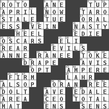 ACROSS 1. Printing process, for short 5. One (Scot) 8. Uncastrated adult male sheep 11. Showery time 13. At this time 14. Pacific island yam 15. Having lost freshness 16. Third day of the wk. 17. Relating to the mouth 18. Double-curved letter 19. Distinctive style or manner 21. Smutty 22. The bottom of a shoe or boot 24. Singer Brickell 25. Motion picture awards 27. Connecticut Ivy Leaguer 29. Located in or toward the back 30. Vices 32. Queen of England 1702-14 33. The wife of a rajah (variant) 35. Casino tip 39. Window treatment 41. Opinion 42. Choose 43. Electrical Unit 45. Securely fixed in place 48. Cowardly lion portrayer 49. Columnist Joseph or Stewart 50. NW Algerian seaport 52. Portuguese money of account (variant) 55. Stupid person 56. "___ Maria" 57. Peak District village in England 59. Length times width 60. Corporate head (abbr.) 61. Add up to 62. Floor protector 63. Followers of ems 64. Elected reps. DOWN 1. To erase 2. Elects 3. File 13 4. Petroleum 5. Opposed to 6. Part of speech 7. She-sheep 8. Tarsus (plural) 9. A salt of uric acid 10. Much (prefix) 12. Crowbar 14. Frog relative 20. Raised railways 21. Famous astronaut Armstrong 23. Having ears or earlike features 25. Mouth or opening 26. Elected rep. 27. Night before a holiday 28. Untruth 30. Compass dir. 31. Staphylococcus 33. Reproach for some lapse or misdeed 34. Fitting 36. Make much ado about nothing 37. Apertif with cassis 38. Compass dir. 40. Frolic 43. According to 44. French painter Edouard 45. Plants 46. Small island 47. Round or rotation of duties 49. First man 50. Baking chamber 51. Vintage cars 53. Style 54. Snakelike fish 56. Adept person 58. Two (Sp.)