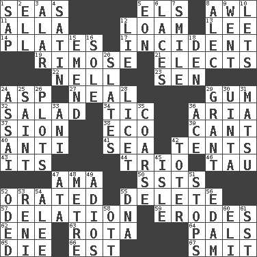 ACROSS 1. Oceans 5. Raised railways 8. Leather borer 11. Silent film actress Nazimova 12. Rich soil 13. Area sheltered from the wind 14. Food holders 17. Event 19. Full of chinks, cracks, or crevices 21. Opts 22. 1994 drama film starring Jodie Foster 23. Elected rep. 24. Cleo's killer 27. Actress Patricia 29. Chewing product 32. First course 34. Nervous spasm 36. Roberta Peters solo 37. The Jewish people; Israel 38. Environmental prefix 39. Patter 40. Against 41. Ocean 42. Portable shelters 43. It is 44. Musical group of three 46. The 19th letter of the Greek alphabet 47. Wet nurse (var.) 50. Fast planes 52. Spoke pompously 55. Keyboard key 57. Accusation by an informer 59. Eats (away) 62. Compass dir. 63. Round or rotation of duties 64. Friends 65. Expire 66. Eastern Standard Time (abbr.) 67. Stricken, poetically DOWN 1. Plant excrement 2. Pipe bend 3. Having or resembling wings 4. Smooth fabric 5. Period of immesurable duration 6. Shoestrings 7. Grin 8. Actor Baldwin 9. Left 10. Allows 12. Whopper 15. Make improvements or corrections to 16. Flatfish 18. Lair 20. Chalkboards 24. Slender Brazilian palm 25. Virtuous person 26. Ground plans 28. It is permitted: Lat. 29. Monetary aid 30. National forest in Provo, Utah 31. Taiwanese island in East China Sea 33. Cuckoo 35. Rough 36. Adept person 42. Carrier 45. Small island 47. "One Day ___ Time" 48. Distance measurement (Brit.) 49. Goodbye (Sp.) 51. Constricts 52. Wrote a lyric poem 53. Painter Guido (1575-1642) 54. Toward shelter 55. Heredity factor (abbr.) 56. Dutch treat 58. Baseball player Mel 60. Connecticut Ivy Leaguer 61. Fast jet (abbr.)