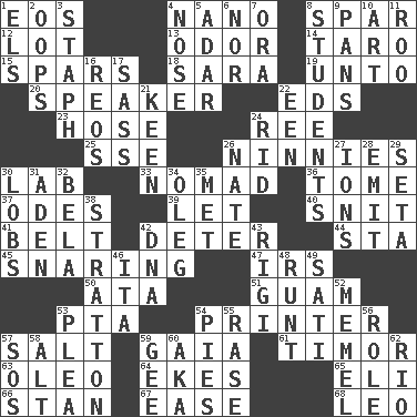 ACROSS 1. Greek goddess of the dawn 4. Billionth: prefix 8. Practice fight 12. Car dealer's back yard 13. Aroma 14. Edible starchy tuberous root 15. Practice fights 18. "Two Mules for Sister ____" 19. To (old English) 20. Orator 22. Begley and Asner 23. Flexible conduit 24. Portuguese money of account (variant) 25. Compass dir. 26. Fools 30. Experiment locale 33. Wanderer 36. Heavy book 37. Lyric poems 39. Allow 40. In a ____ (agitated or irritated) 41. Waist strap 42. Prevent from occurring 44. R.R. building 45. Catching in a trap 47. Big collection agency 50. "One Day ___ Time" 51. Island territory of the United States 53. Parent Teacher Assoc. 54. Hard copy producer 57. Table seasoning 59. Greek goddess of the earth (variant) 61. Southeast Indonesia island 63. Butter sub 64. Supplements with great effort 65. Biblical high priest 66. Comedian Laurel of Laurel & Hardy 67. Comfort 68. Lion DOWN 1. Raised railways 2. I made a mistake 3. Staphylococcus 4. Characteristic smell of wine 5. The sixth month of the Jewish calendar 6. Not either 7. Mouth or opening 8. SAT takers 9. Zero-star reviews 10. Tate display 11. Friend of Pooh 16. Vintage cars 17. Backtalk 21. Peachy ____! 22. Car or cant ending 24. To free from 26. Nathan's nickname 27. Charged atoms 28. Send forth 29. Stalk of a moss capsule 30. Tennis shots 31. An important port of Yemen 32. Actor Lugosi 34. Cassini of fashion 35. Was introduced to 38. Ski resort town in Vermont 42. Heredity factor (abbr.) 43. Swiss mountan, "Queen of the Mountains" 46. Call ___ day 48. The smallest animal of a litter 49. Suttee (variant) 52. Klaipeda city 53. Entreaty 54. Sliced desserts 55. To erase 56. Hero or heavy, e.g. 57. Distress signal 58. The first octave above the treble staff 59. Unit of force equal to gravity 60. Alias (abbr.) 62. _ de Janeiro