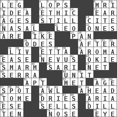 ACROSS 1. Part of a journey 4. Chops off 8. Medical imaging device (abbr.) 11. The main thing one is thinking about 13. Moral principle 15. Ewer handle 16. Matures 17. Not moving 18. Quote 19. Relating to the nose 21. Lion 22. Washington bills 23. "We ___ not amused" (Victoria) 24. D.D.E's nickname 27. Baking dish 29. Lyric poems 30. Following 34. 54 in ancient Rome 36. Singer James 39. Scent 40. Relaxation 41. Congenital growth or mark on the skin 43. Migrant worker of the '30s 44. Excessive but superficial compliments 46. Indian skirt 47. Fish or hair follower 48. Father Junipero _ 49. A single undivided whole 51. Fitting 53. Was introduced to 54. Personal question 57. Specific locale 60. Leather borer 63. Forward in time 65. Heavy book 66. Frees from moisture 69. Roberta Peters solo 70. Compass dir. 71. Makes a sale 72. Deli pickle 73. Nine, plus one 74. Olfactory organ 75. Sight organ DOWN 1. Climbing, woody, usually tropical vines 2. _ Allan Poe 3. Honkers 4. French article 5. Baseball player Mel 6. Silvers or Donahue 7. Drop; flow; fall 8. Count _ (2 wds.) 9. Pace 10. Angers 12. White ___ sheet 14. Hoof sound 18. Meet 20. Flaplike covering 25. Peachy ____! 26. _____ Park, CO 28. American Automobile Association (abbr.) 29. Make much ado about nothing 31. Casino tip 32. Send forth 33. Actress Charlotte 34. Unable to walk 35. Austrian river, tributary to the Danube 37. Federal power corp. 38. Gold (Symbol: Au) 40. Curvy letter 42. Trig term 45. Atlas unit 50. Call ___ day 52. Small amounts or degrees 54. Nest on high 55. Lightheartedly 56. Peak District village in England 57. Proofreading order 58. Introduce or present, as a question 59. Sign of things to come 61. Songbird 62. _ and Stitch 64. Possessed 67. Raised railways 68. Compass dir.