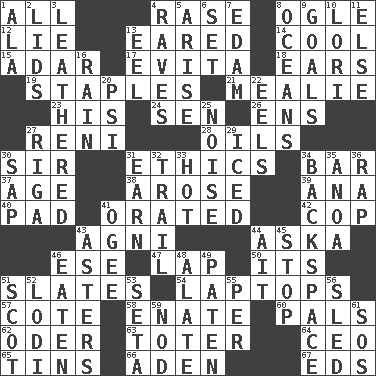 ACROSS 1. 100% 4. Raze (variant) 8. Stare at amorously 12. Whopper 13. Having ears or earlike features 14. Calm and collected 15. The sixth month of the Jewish calendar 17. Webber/Rice musical 18. Hearing organs 19. Paper fasteners 21. Ear of corn 23. Part of HMS, perhaps 24. Elected rep. 26. Followers of ems 27. Painter Guido (1575-1642) 28. Lubricates 30. Title for a knight 31. Moral principles 34. Oblong piece of solid material 37. Grow older 38. Came up 39. Santa ___, CA 40. Groovy apt. 41. Spoke pompously 42. Police officer (slang) 43. Hindu god of fire 44. "____ silly question..." 46. Compass dir. 47. Pet locale 50. ___ a Wonderful Life 51. Chalkboards 54. Portable computers 57. ____ d'Azur (French Riviera) 58. Maternal 60. Friends 62. River in Europe 63. Carrier 64. Corporate head (abbr.) 65. Metal containers 66. Arabian gulf 67. Begley and Asner DOWN 1. Chicken ___ king 2. Hats (slang) 3. Tough but pliablecoriaceous 4. All-night dance parties 5. Ascend 6. Arrange properly for use 7. Dutch treat 8. Seas 9. Finish lines 10. Australian parrot (variant) 11. Otherwise 13. Snakelike fish 16. Water falling in drops from the sky 20. 23rd letter of the Greek alphabet 22. Snakelike fish 25. Annoying sound 27. Port city in Latvia 29. On the rocks 30. Plant excrement 31. Merit 32. Lag or linger behind 33. Being at a high temperature 34. Keyboard key 35. Small Philippine buffalo 36. Reproach for some lapse or misdeed 41. Double curve, resembling the letter S 43. Michaelmas daisies 44. Small island 45. Halt 46. Consumed 48. Having winglike extensions 49. Eucharist need 51. Highlander 52. Farming town in central California 53. Bristle 55. For each 56. Downhill vehicle 59. Dreamland 61. Distress signal